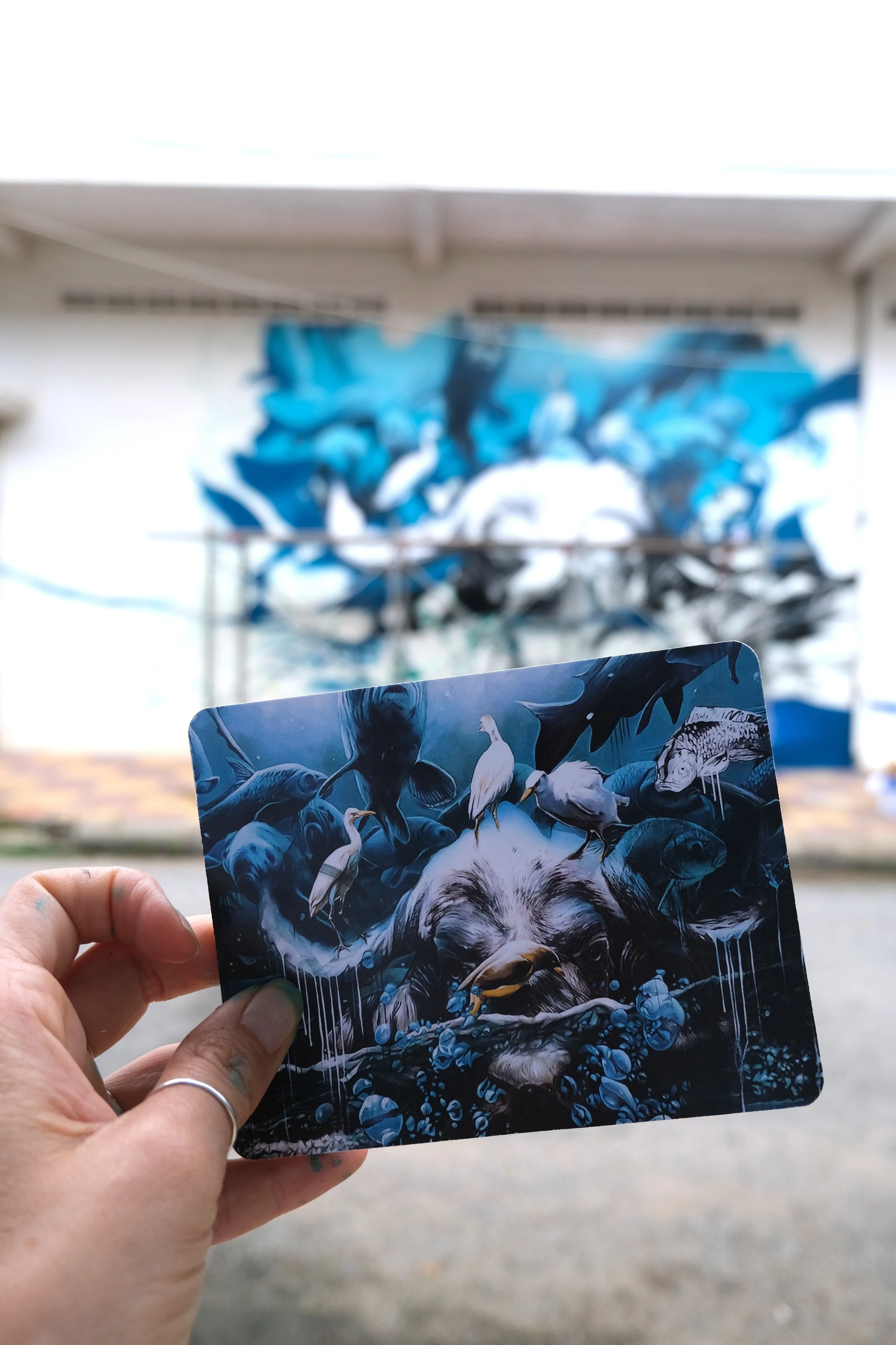 We were thrilled to take part in this year’s S’Art Festival in beautiful Battambang, Cambodia. The mural’s concept revisits a piece from Dom’s Zoetic series, which explores the symbiotic relationships found in nature. Originally inspired by our time in Southeast Asia in 2020, it felt especially fitting to reimagine the work as a large-scale mural in Cambodia—on the walls of a Buddhist temple—where themes of interconnection, symbolic storytelling through animals, and sustainability deeply resonate.