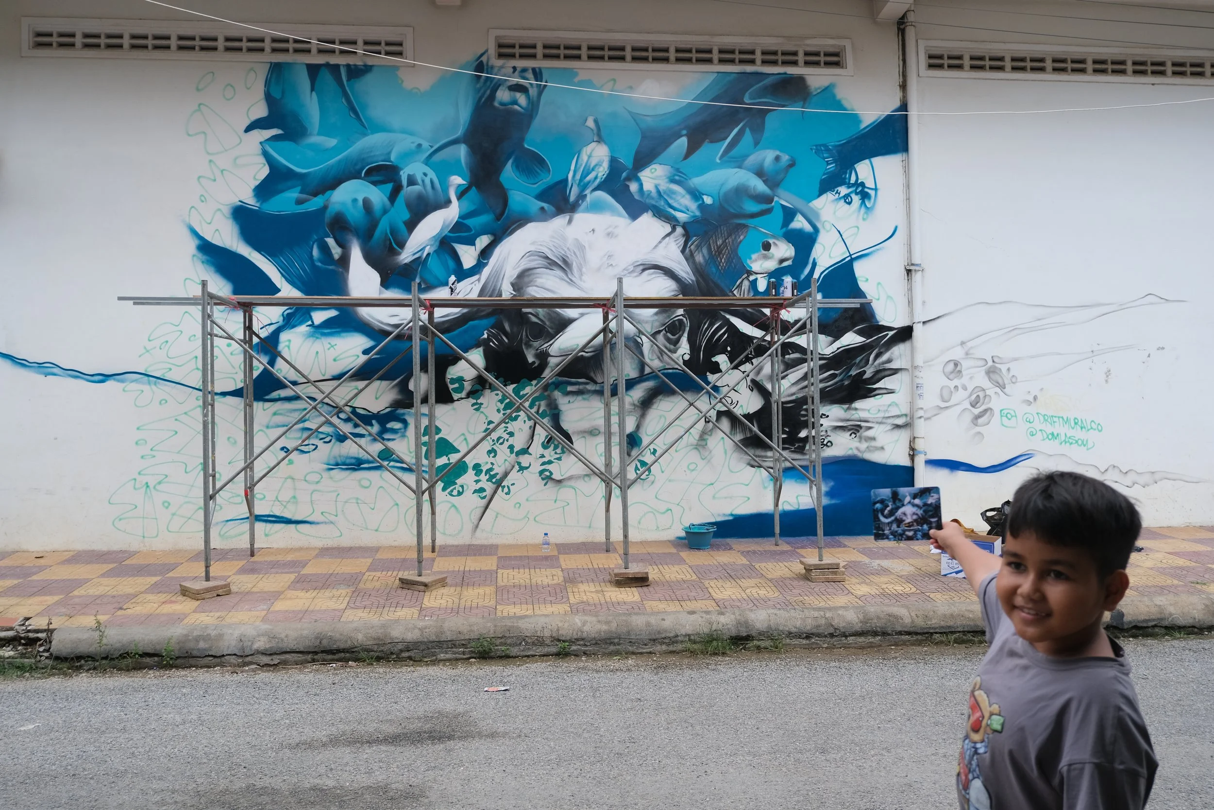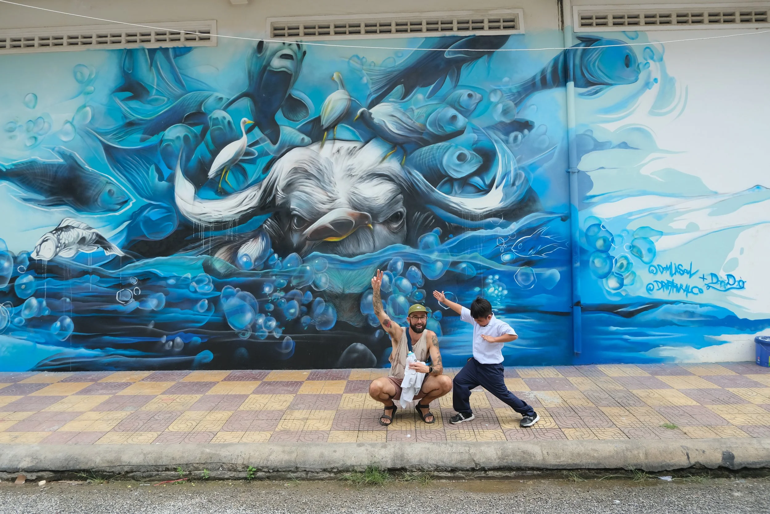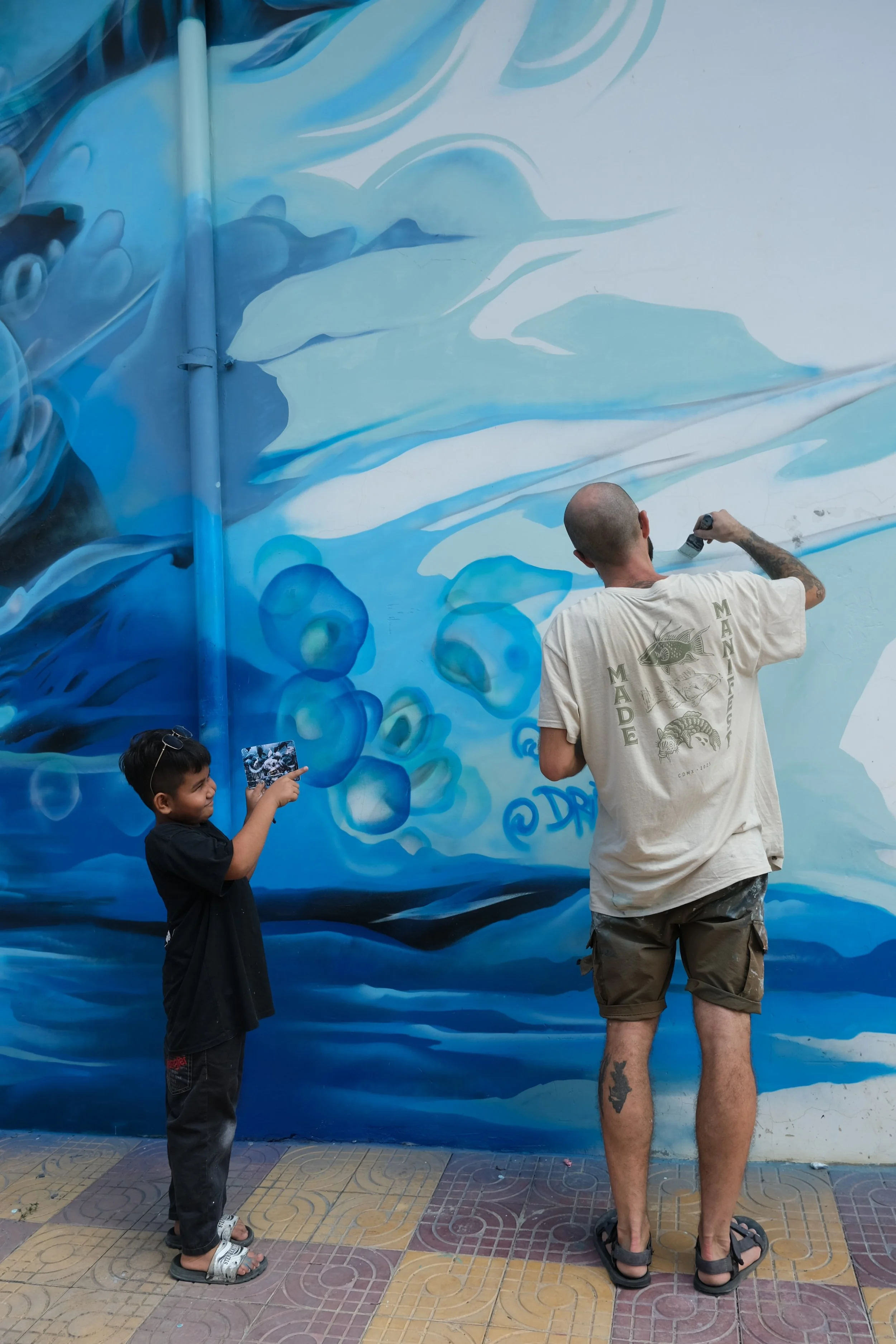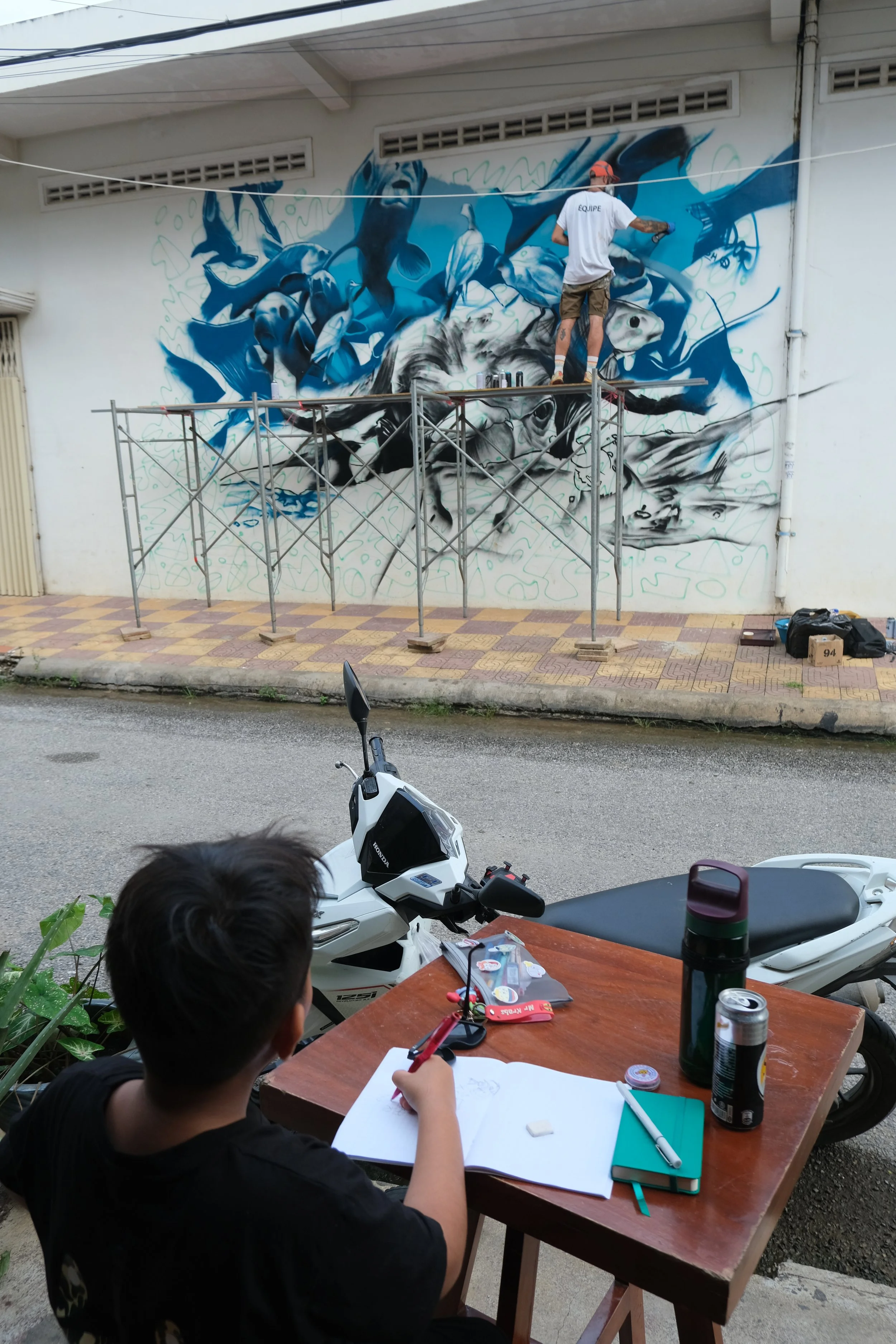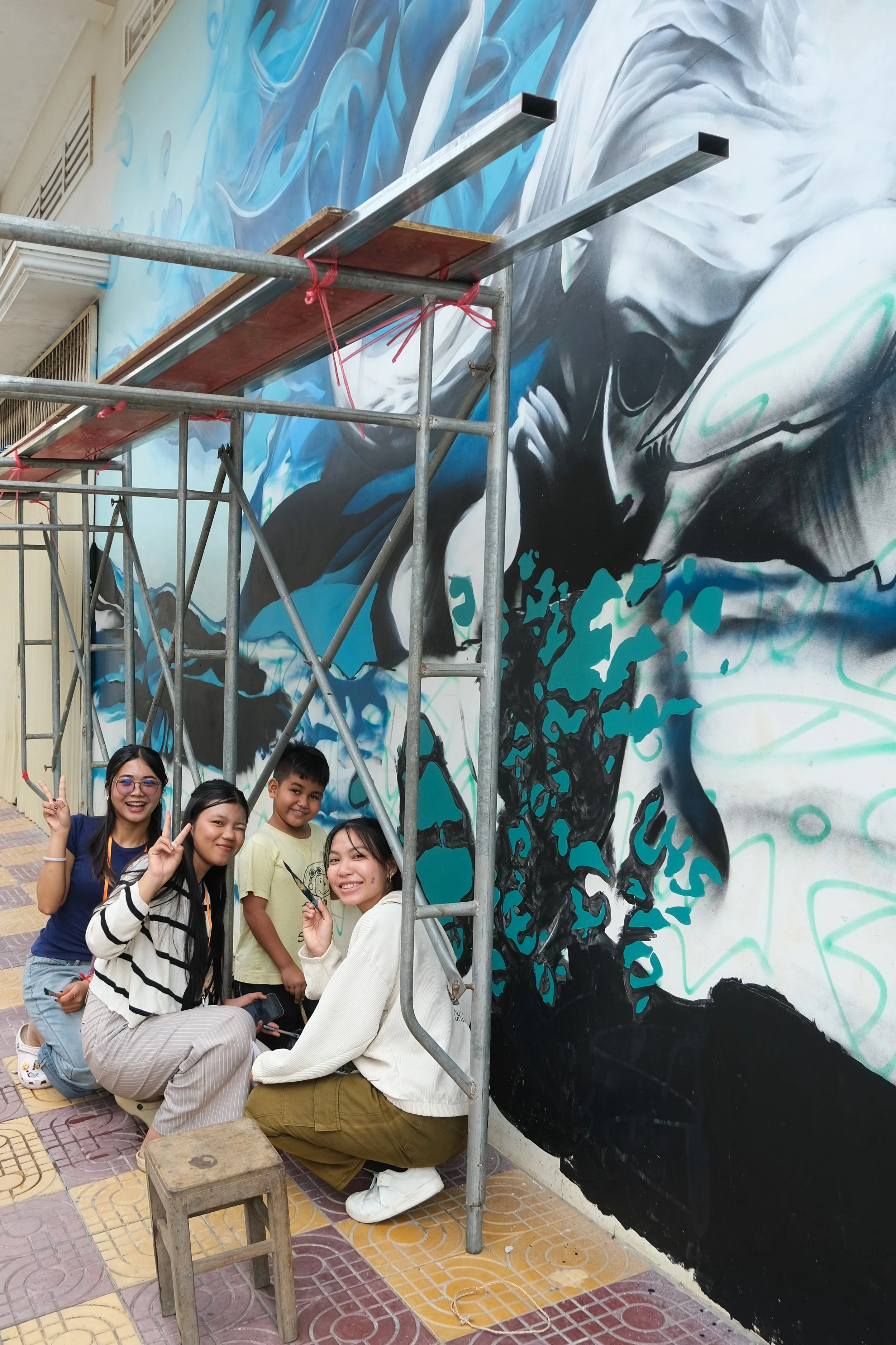 A heartfelt thank you to Fonki for the invitation, to the many organizers who made this year’s festival possible, and to our amazing assistant Seavhuo. Most of all, our gratitude goes to Dodo—the nine-year-old neighbor who spent his days in front of the mural sketching, chatting, and lending a hand with the painting. His joy and curiosity captured the true spirit of community that this mural represents.