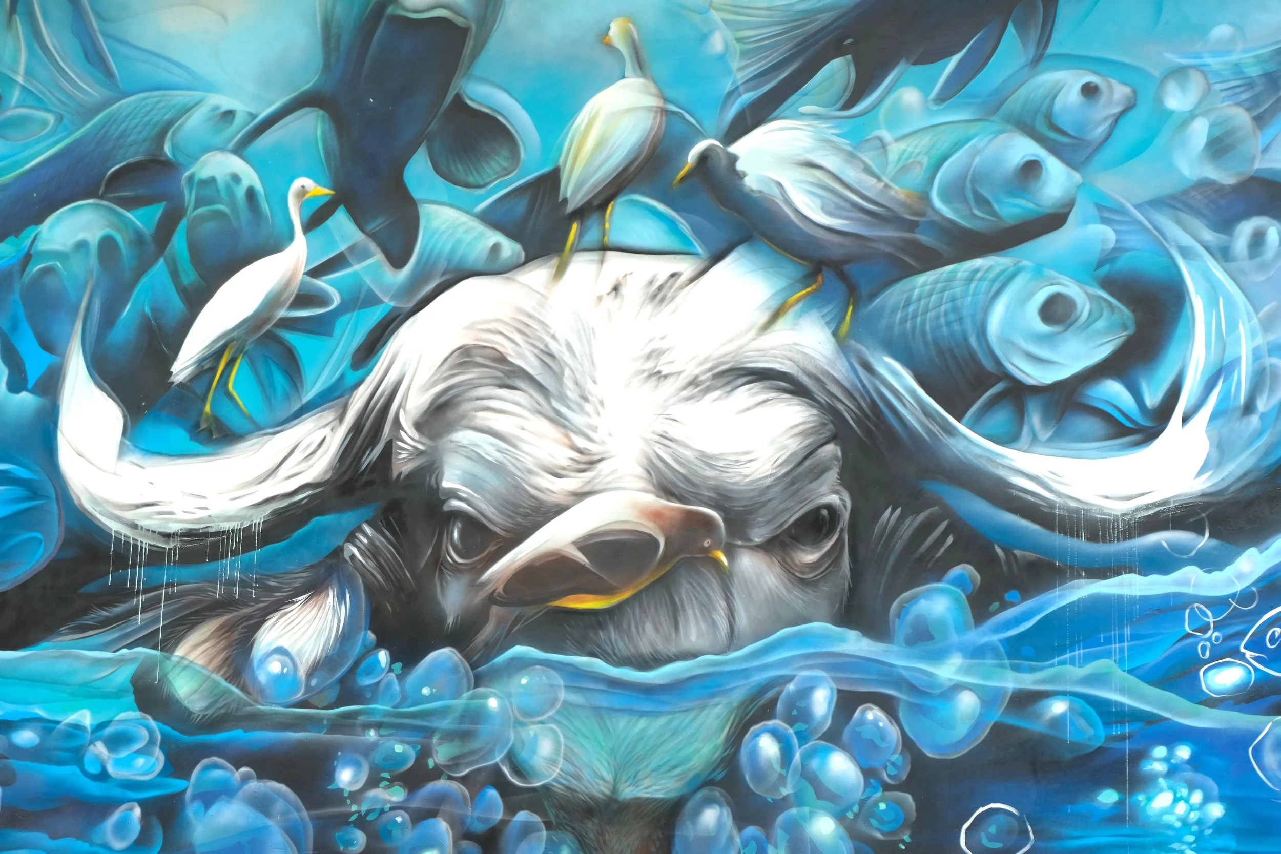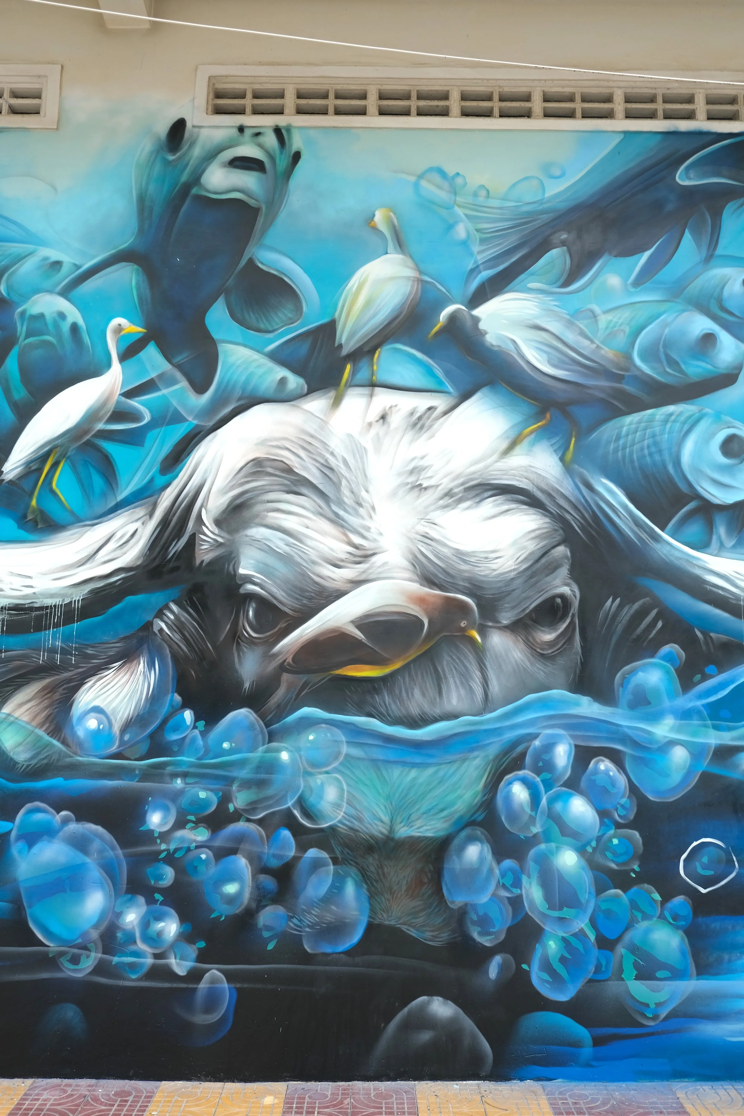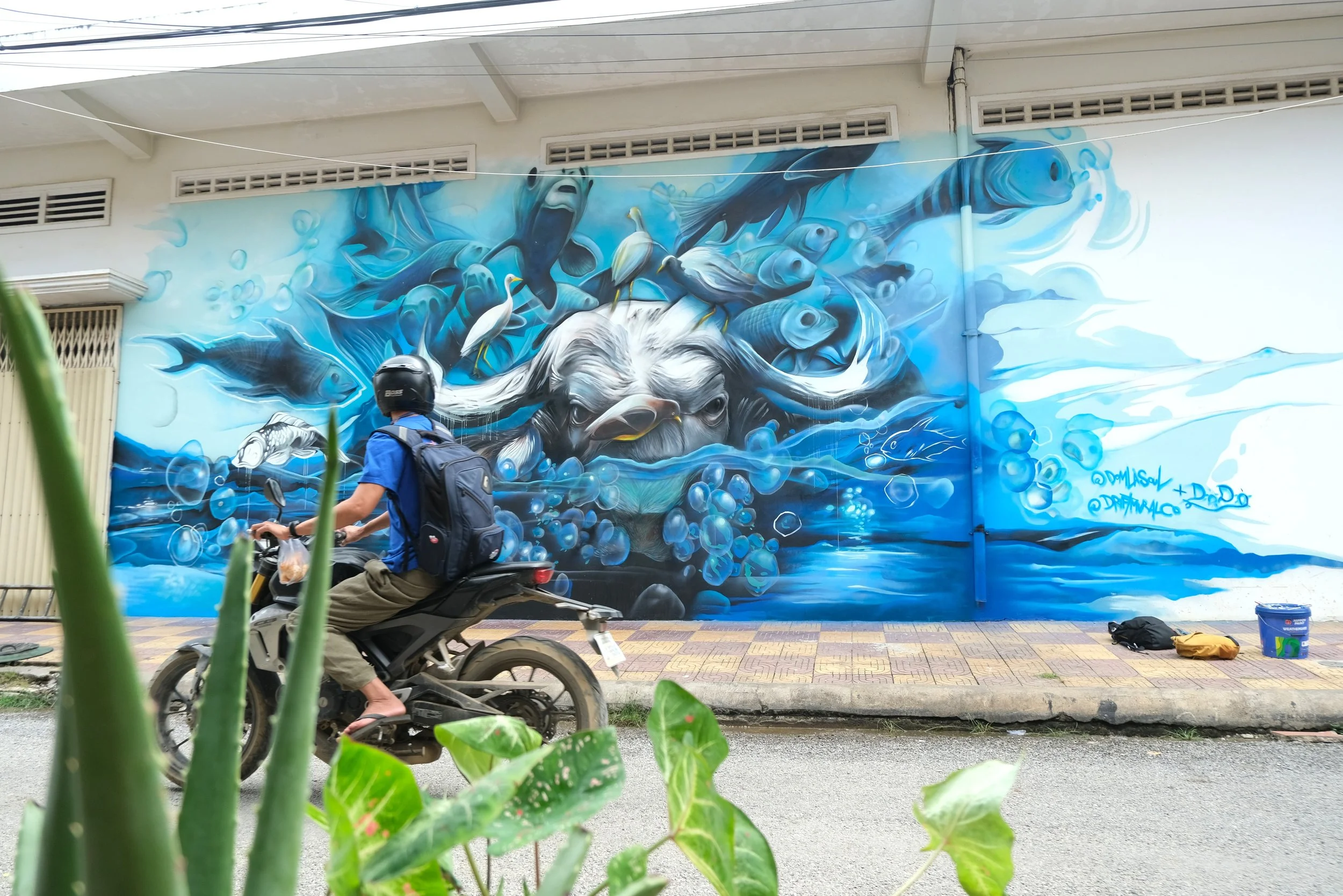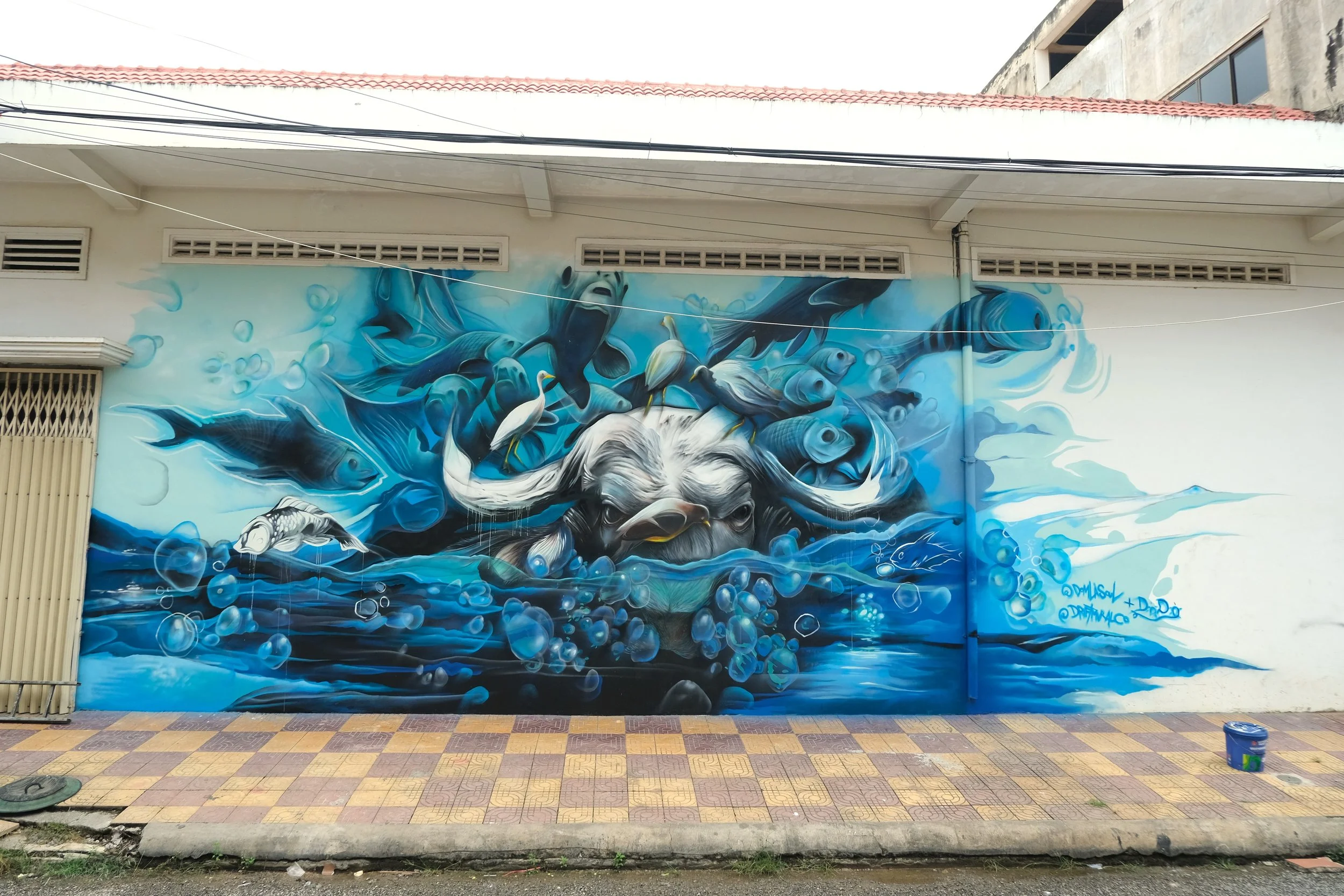 At the center of the composition stands a water buffalo, a powerful emblem in Cambodian culture symbolizing strength, endurance, and the sacred bond between people and the land. Traditionally an essential partner in rice farming, the buffalo represents resilience, nourishment, and harmony with nature. Surrounding it are fish and a white egret—species that naturally coexist in a delicate balance. Together, these elements of earth, air, and water form a poetic metaphor for the interconnectedness of all living things, including our own place within that web. A single fish rendered in chrome serves as a quiet reminder of the growing tension between the natural and industrial worlds. Above the mural, sketch-like lines weave through the scene, bridging Dom’s distinct visual styles and symbolizing the idea that every journey—creative or otherwise—begins with a single step.