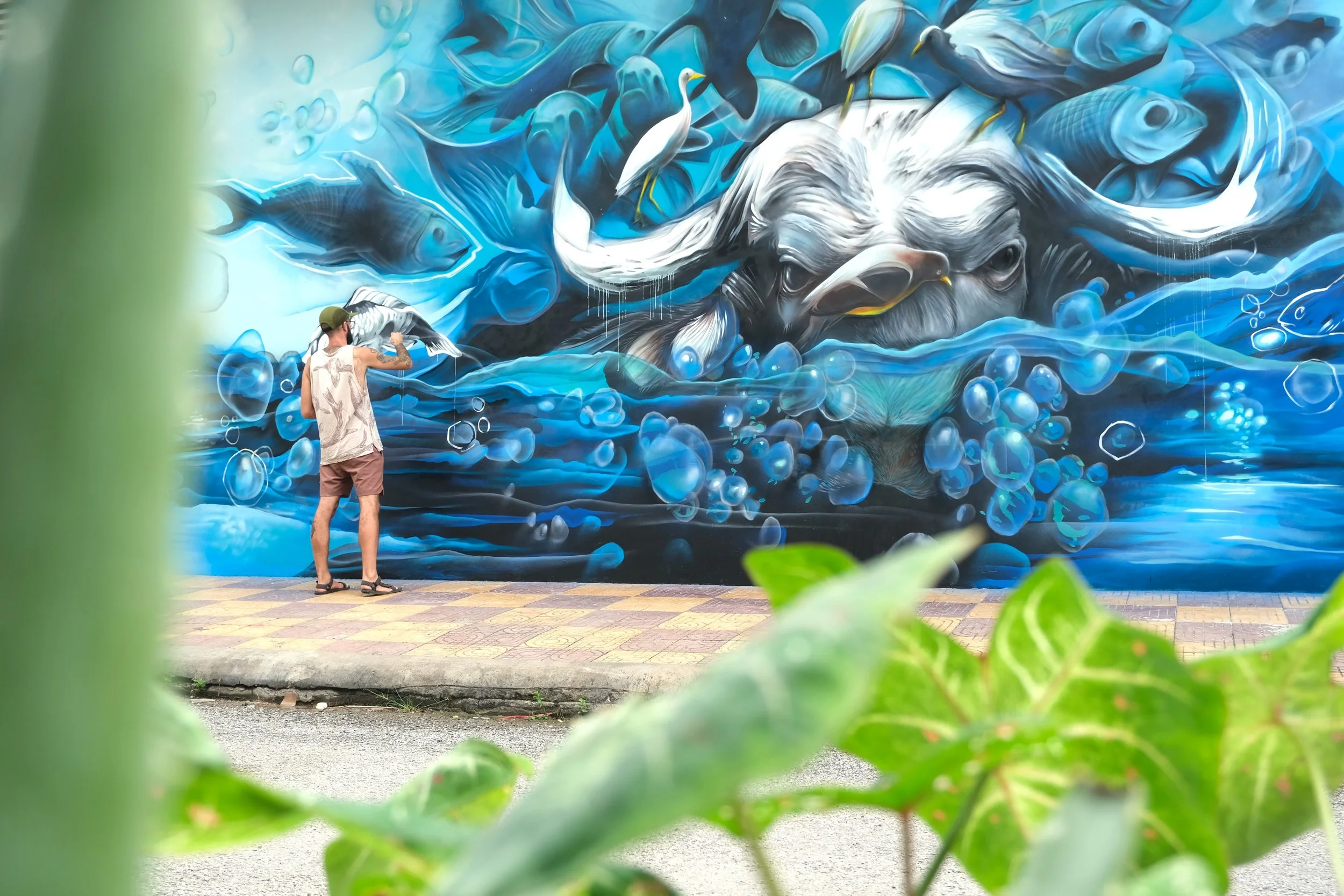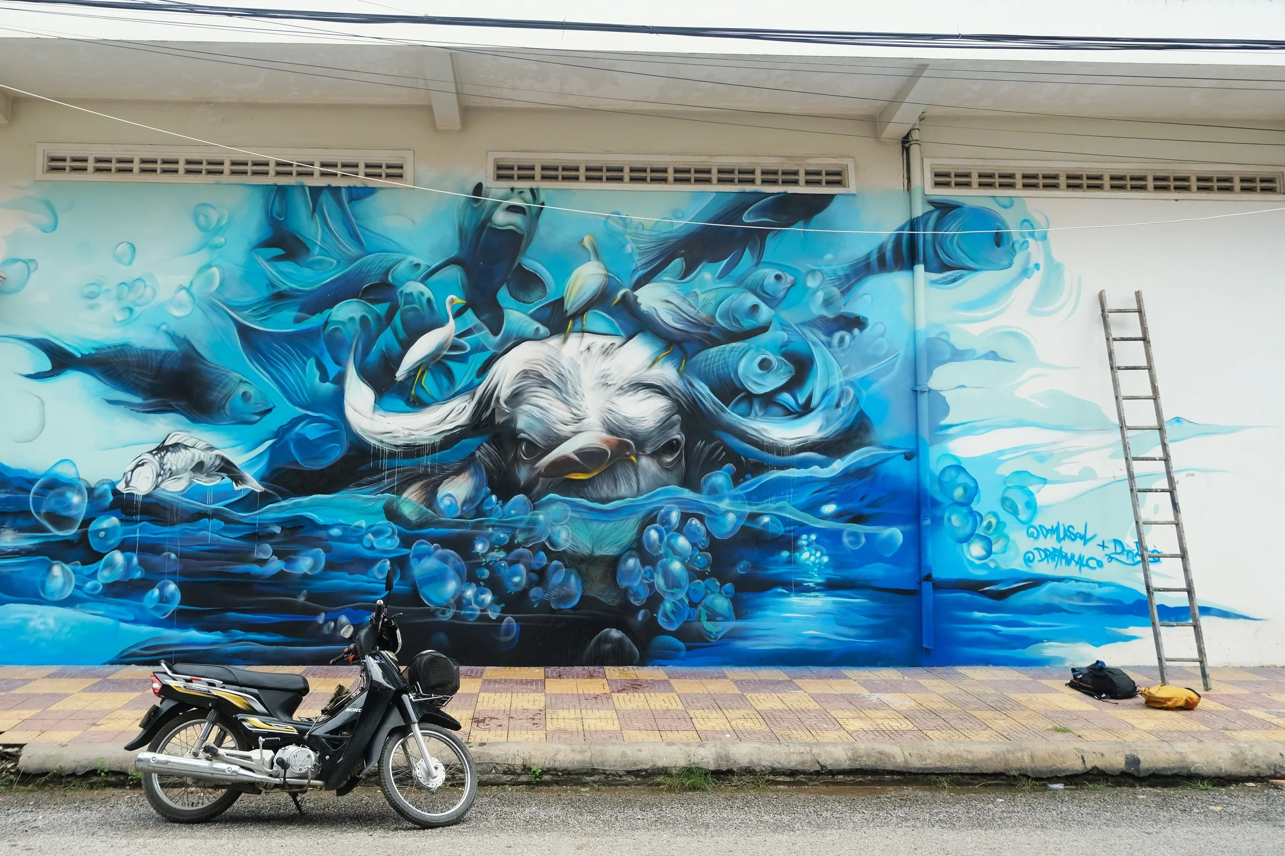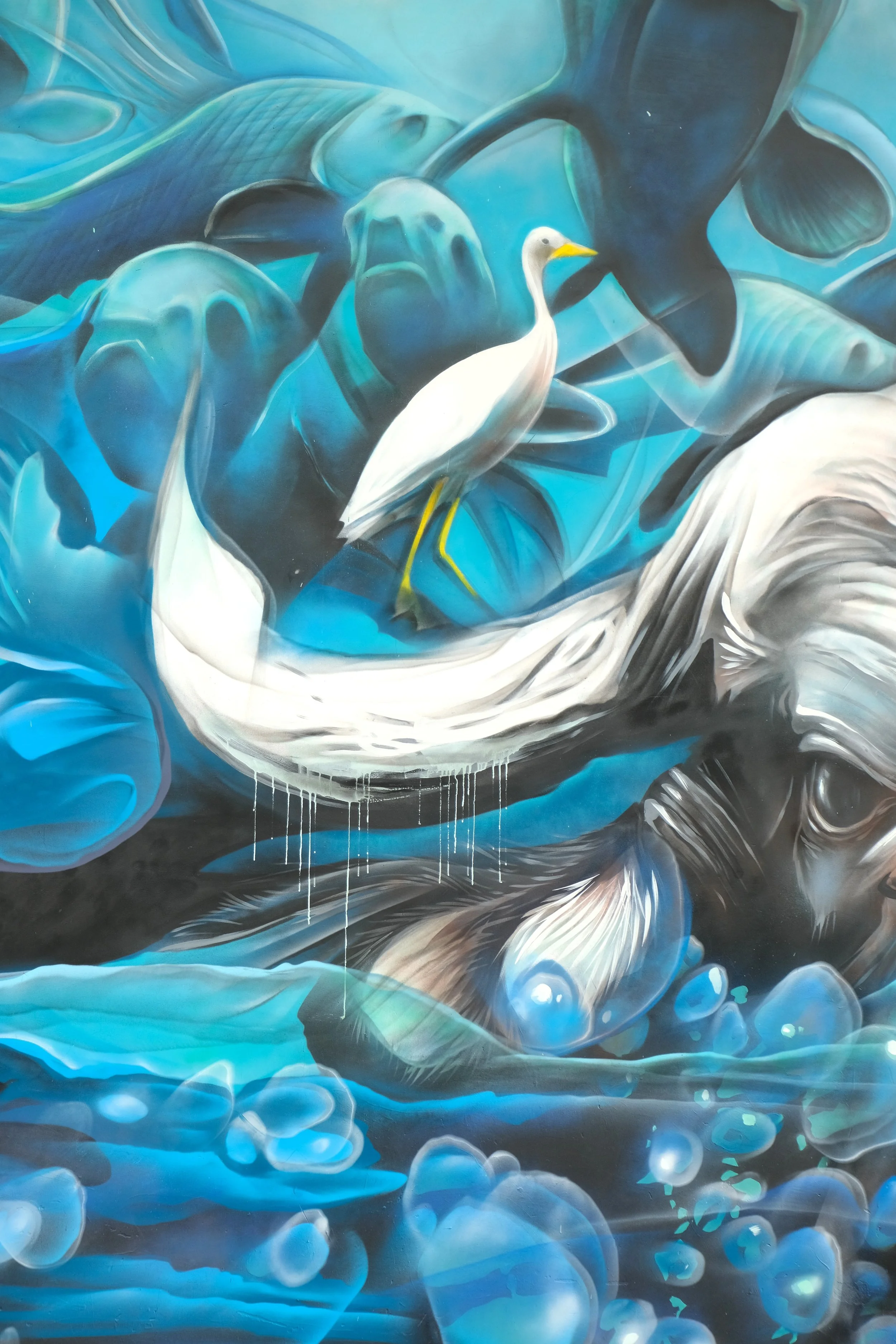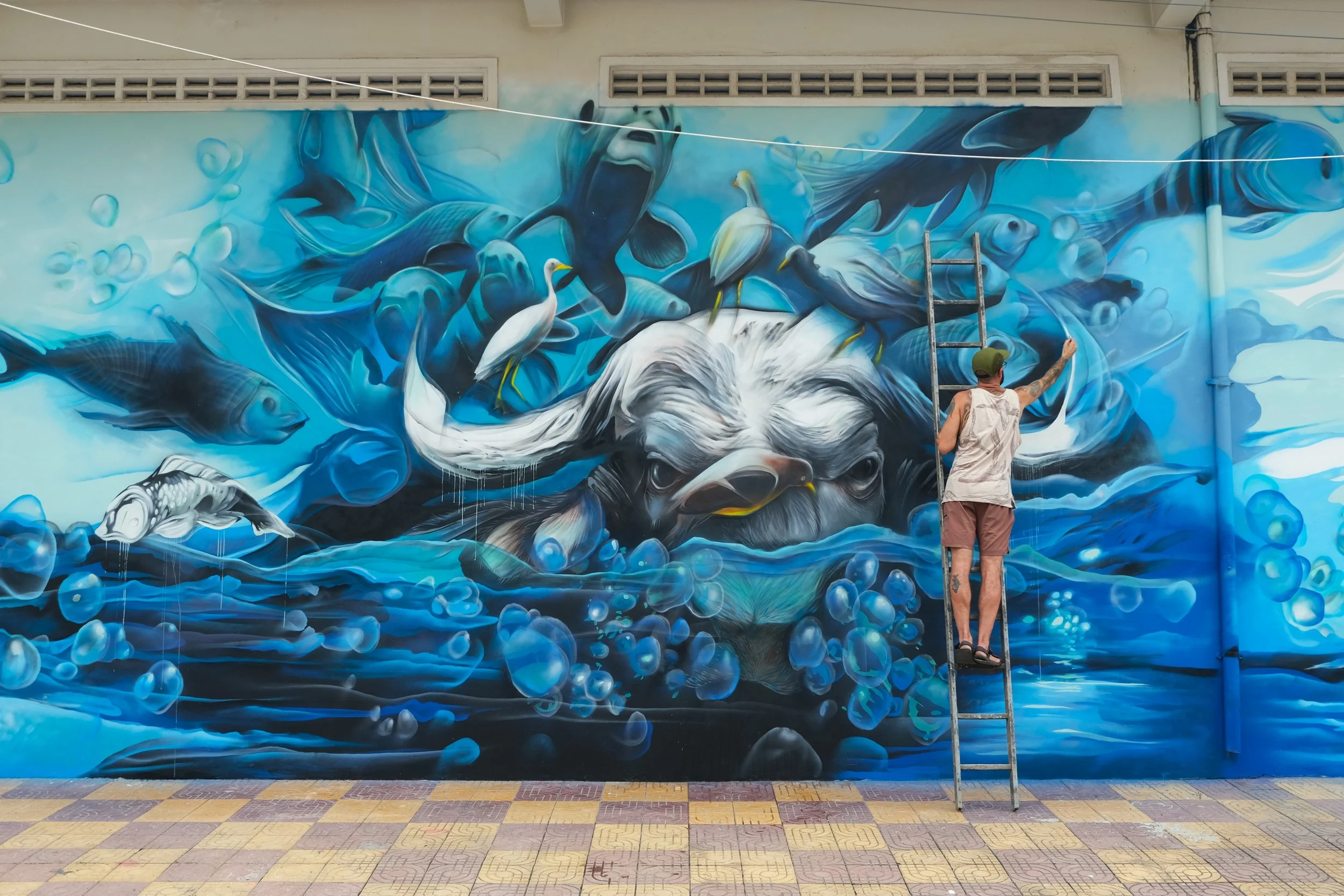At the center of the composition stands a water buffalo, a powerful emblem in Cambodian culture symbolizing strength, endurance, and the sacred bond between people and the land. Traditionally an essential partner in rice farming, the buffalo represents resilience, nourishment, and harmony with nature. Surrounding it are fish and a white egret—species that naturally coexist in a delicate balance. Together, these elements of earth, air, and water form a poetic metaphor for the interconnectedness of all living things, including our own place within that web. A single fish rendered in chrome serves as a quiet reminder of the growing tension between the natural and industrial worlds. Above the mural, sketch-like lines weave through the scene, bridging Dom’s distinct visual styles and symbolizing the idea that every journey—creative or otherwise—begins with a single step.