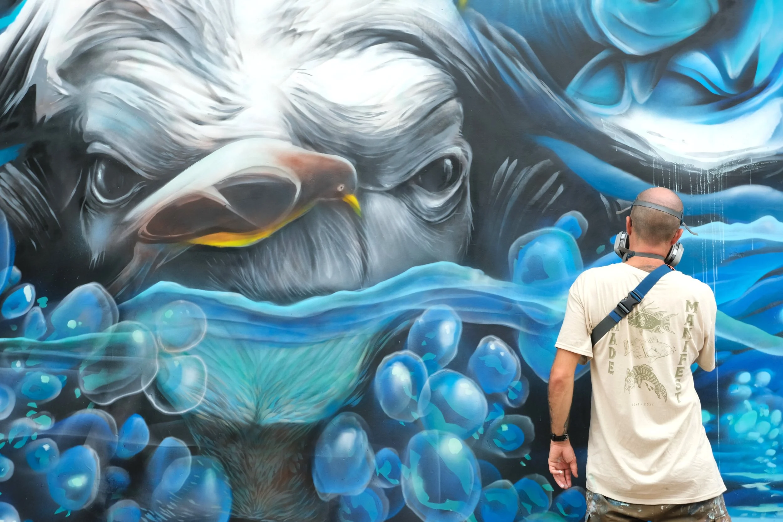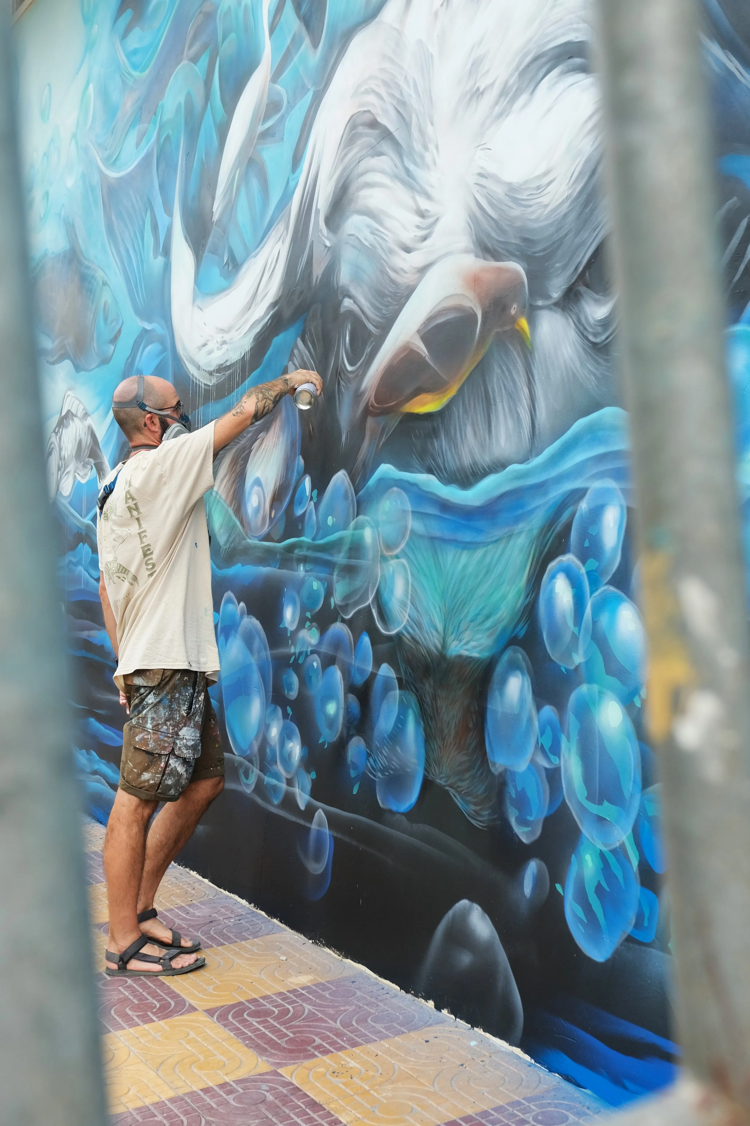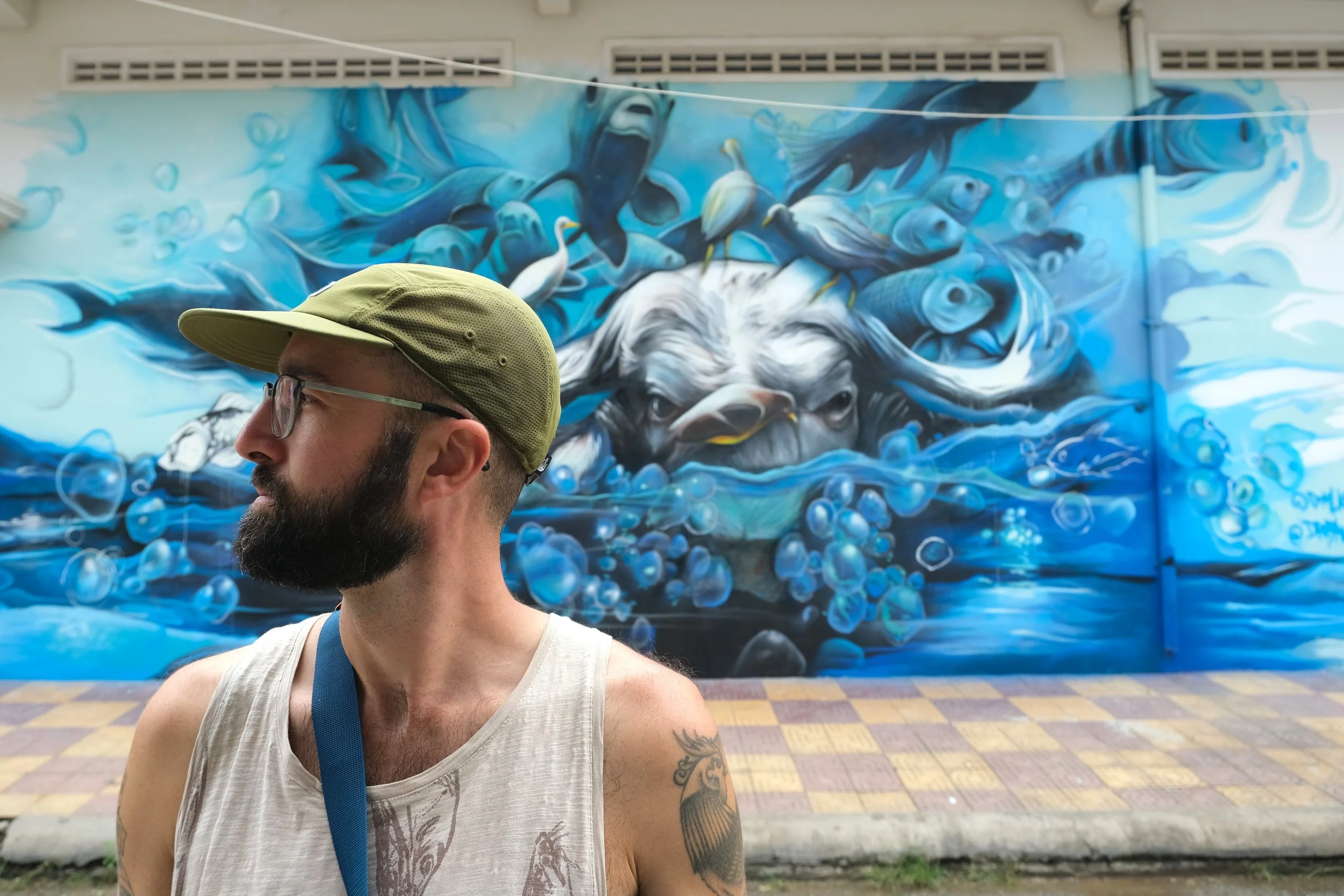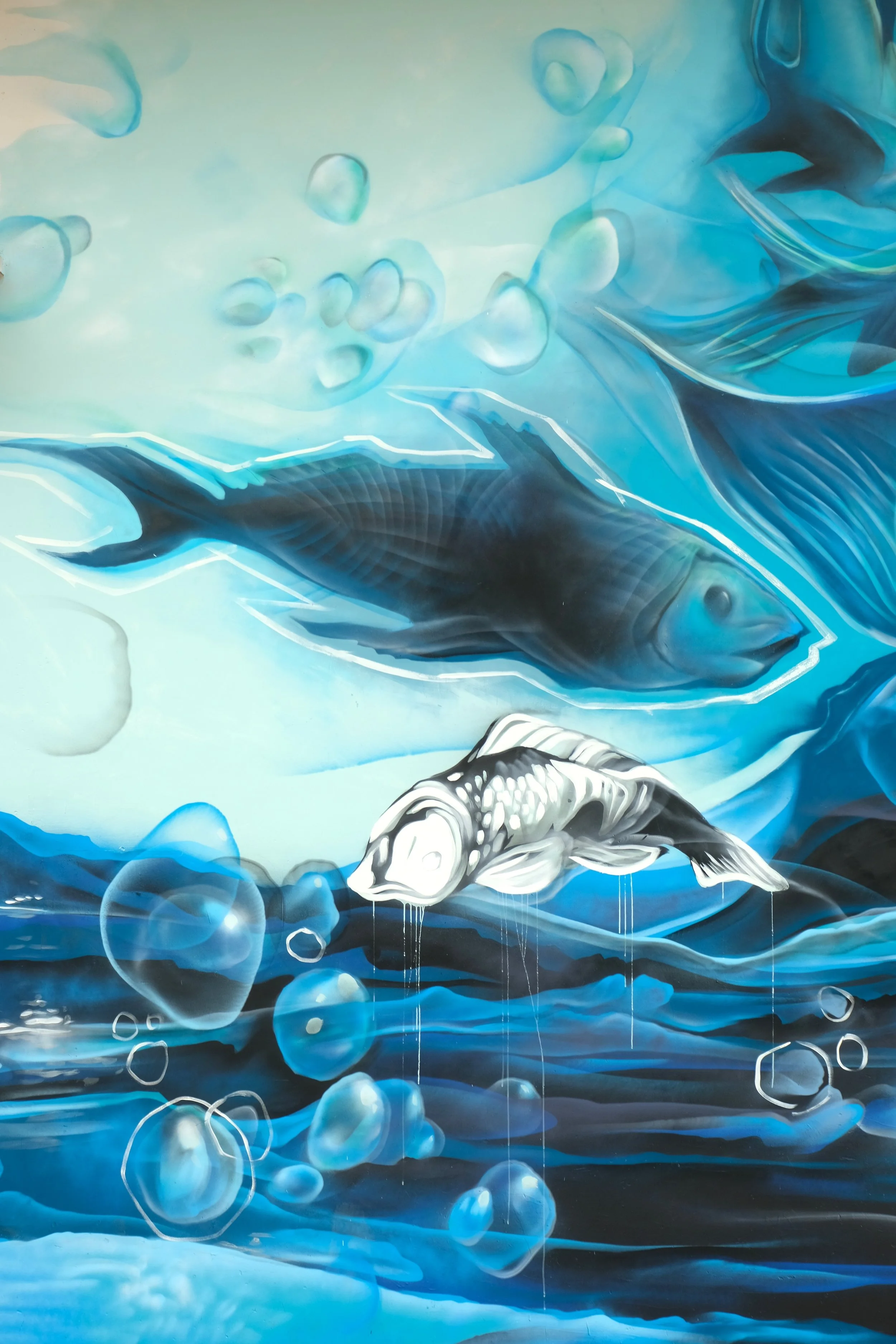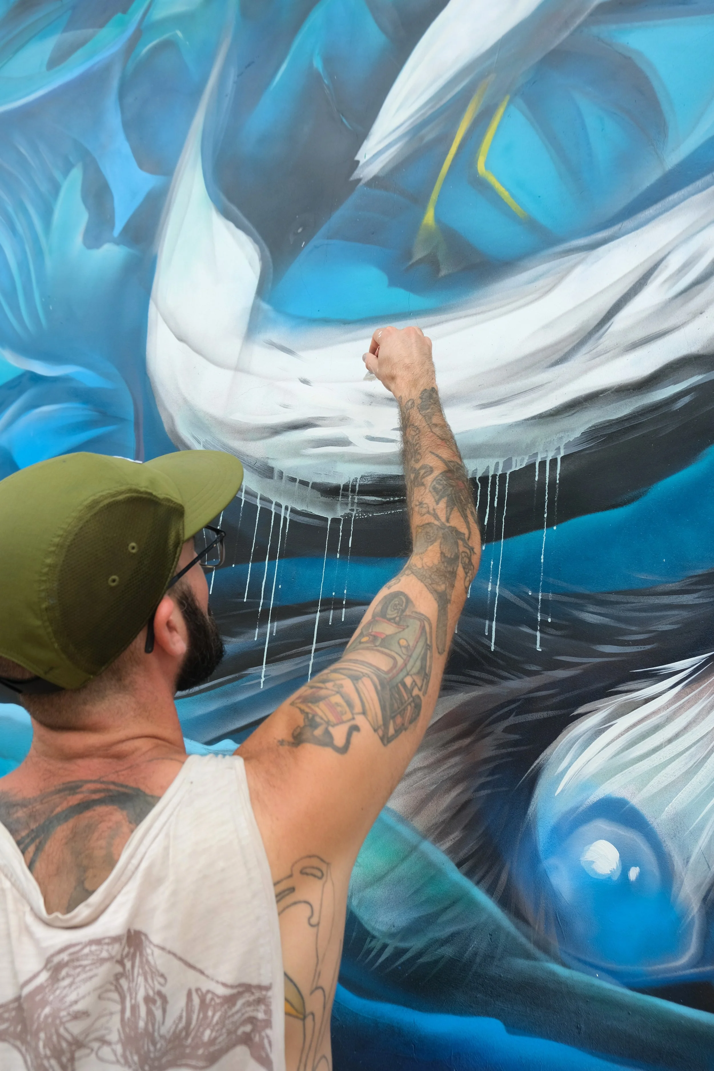 At the center of the composition stands a water buffalo, a powerful emblem in Cambodian culture symbolizing strength, endurance, and the sacred bond between people and the land. Traditionally an essential partner in rice farming, the buffalo represents resilience, nourishment, and harmony with nature. Surrounding it are fish and a white egret—species that naturally coexist in a delicate balance. Together, these elements of earth, air, and water form a poetic metaphor for the interconnectedness of all living things, including our own place within that web. A single fish rendered in chrome serves as a quiet reminder of the growing tension between the natural and industrial worlds. Above the mural, sketch-like lines weave through the scene, bridging Dom’s distinct visual styles and symbolizing the idea that every journey—creative or otherwise—begins with a single step.