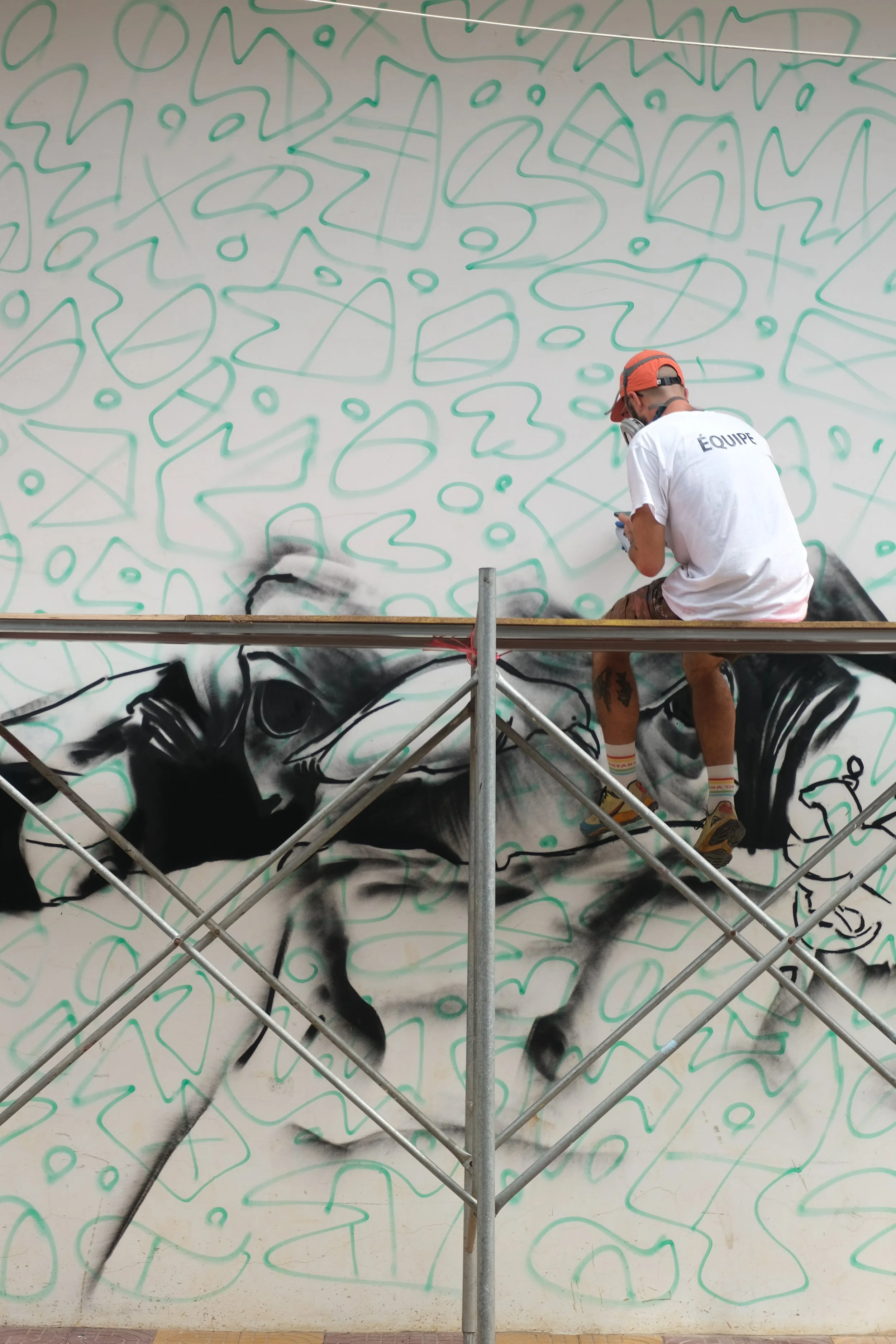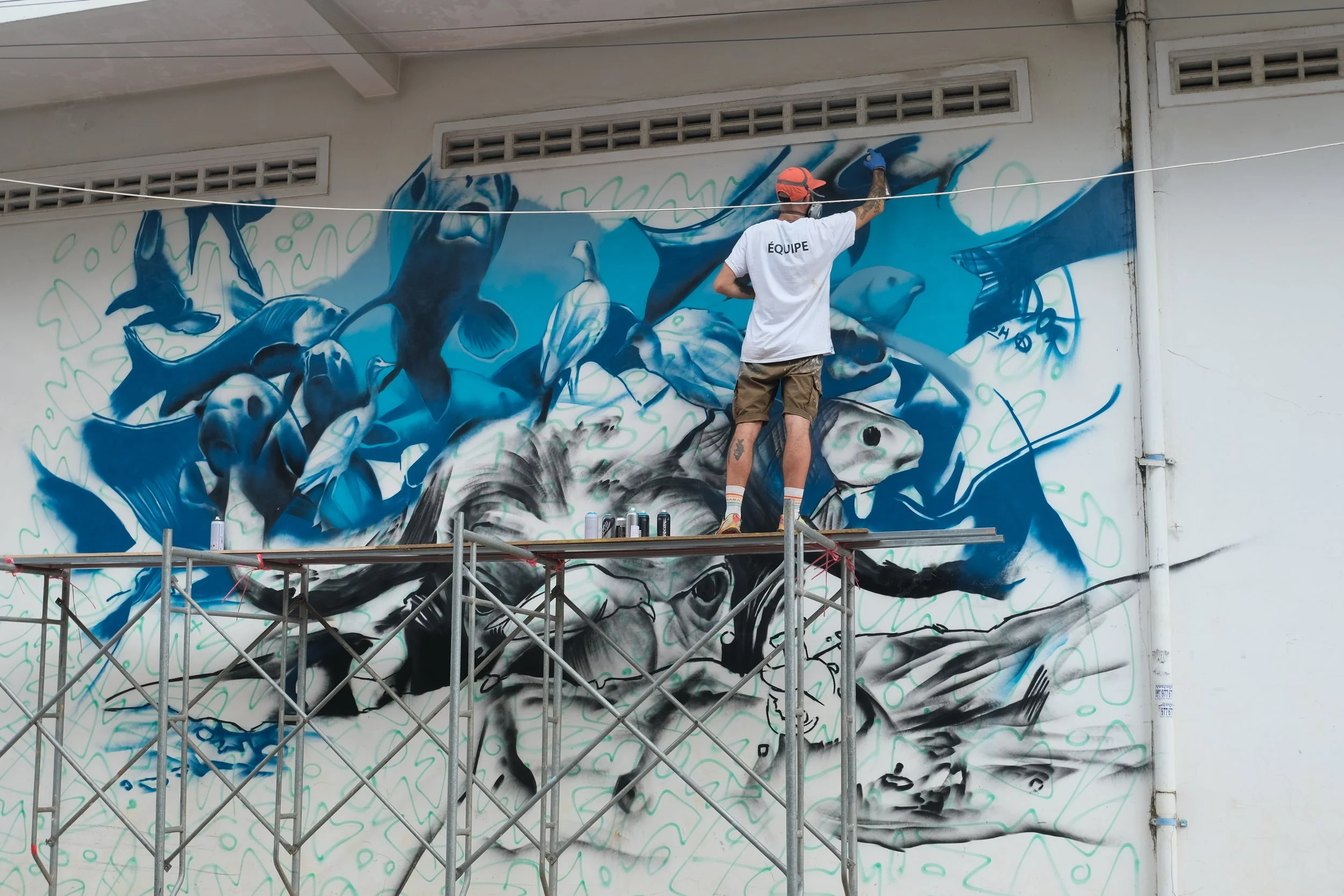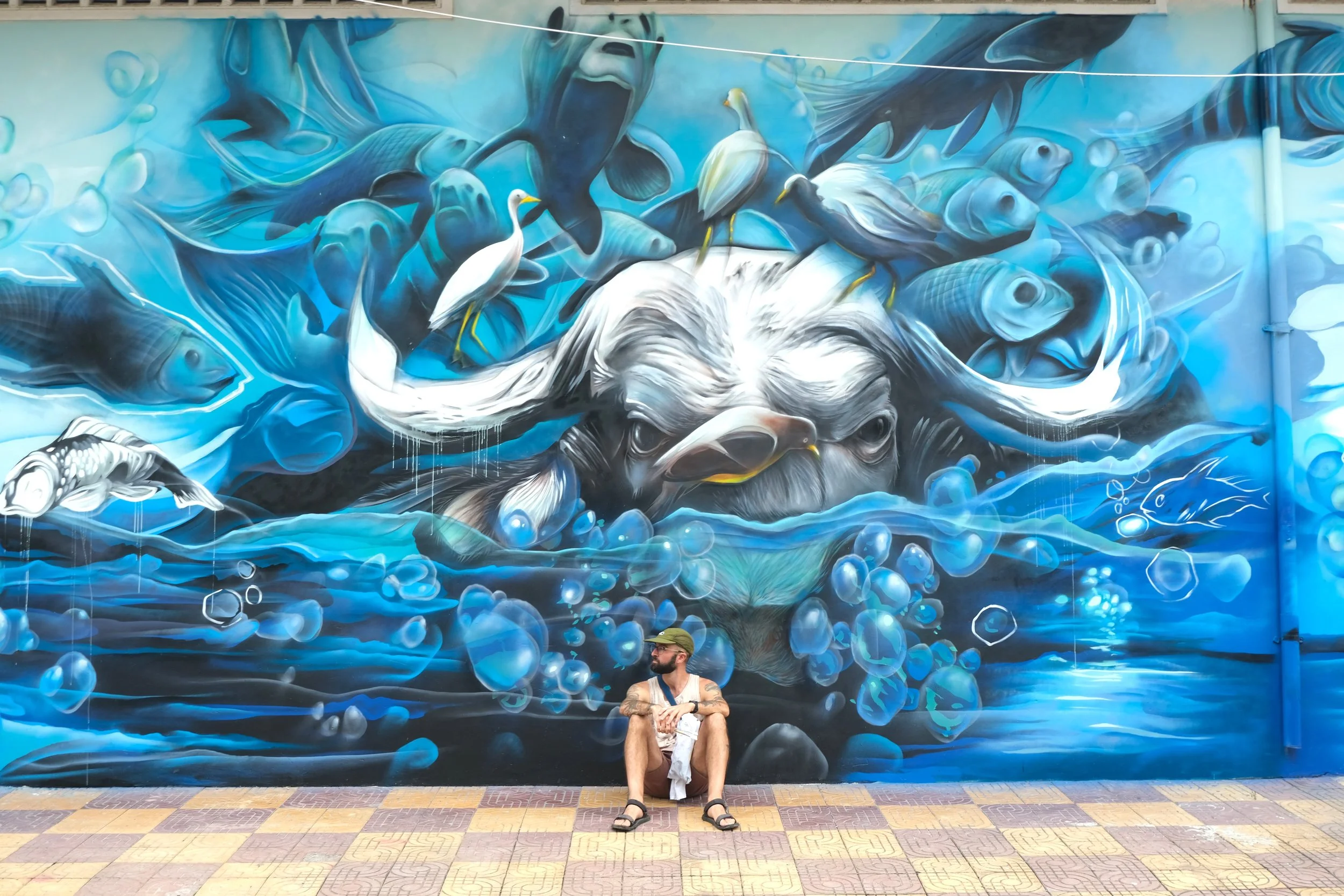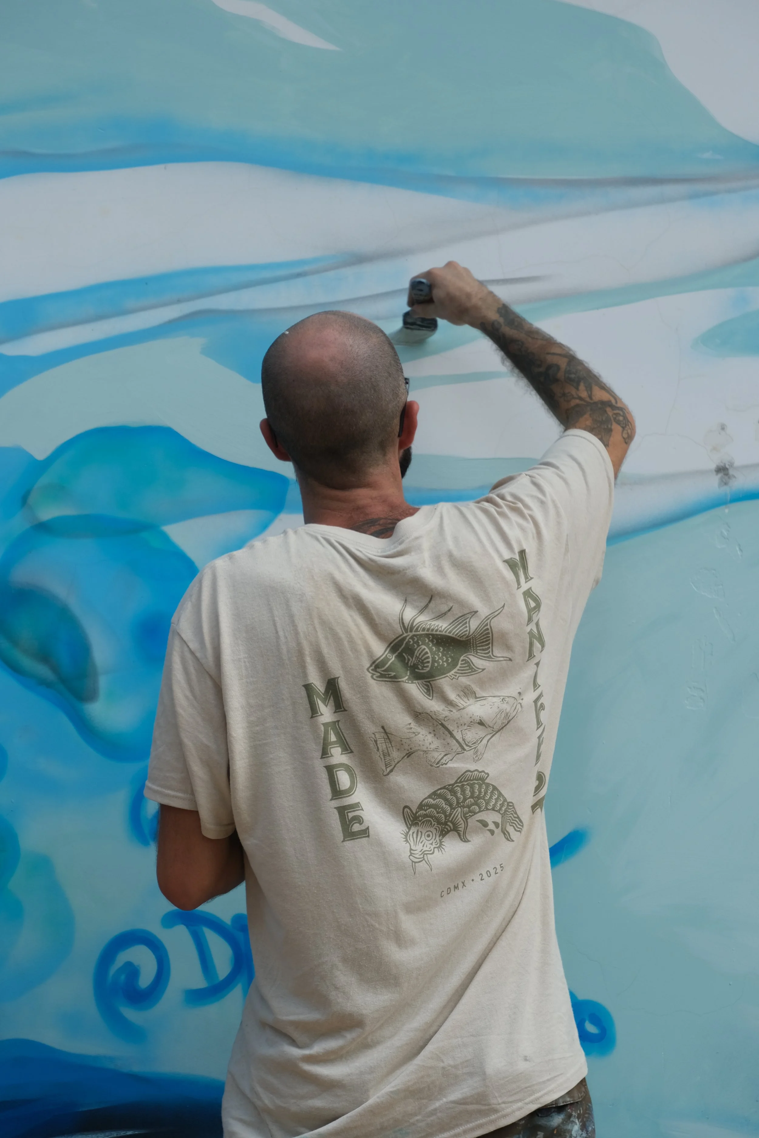 At the center of the composition stands a water buffalo, a powerful emblem in Cambodian culture symbolizing strength, endurance, and the sacred bond between people and the land. Traditionally an essential partner in rice farming, the buffalo represents resilience, nourishment, and harmony with nature. Surrounding it are fish and a white egret—species that naturally coexist in a delicate balance. Together, these elements of earth, air, and water form a poetic metaphor for the interconnectedness of all living things, including our own place within that web. A single fish rendered in chrome serves as a quiet reminder of the growing tension between the natural and industrial worlds. Above the mural, sketch-like lines weave through the scene, bridging Dom’s distinct visual styles and symbolizing the idea that every journey—creative or otherwise—begins with a single step.