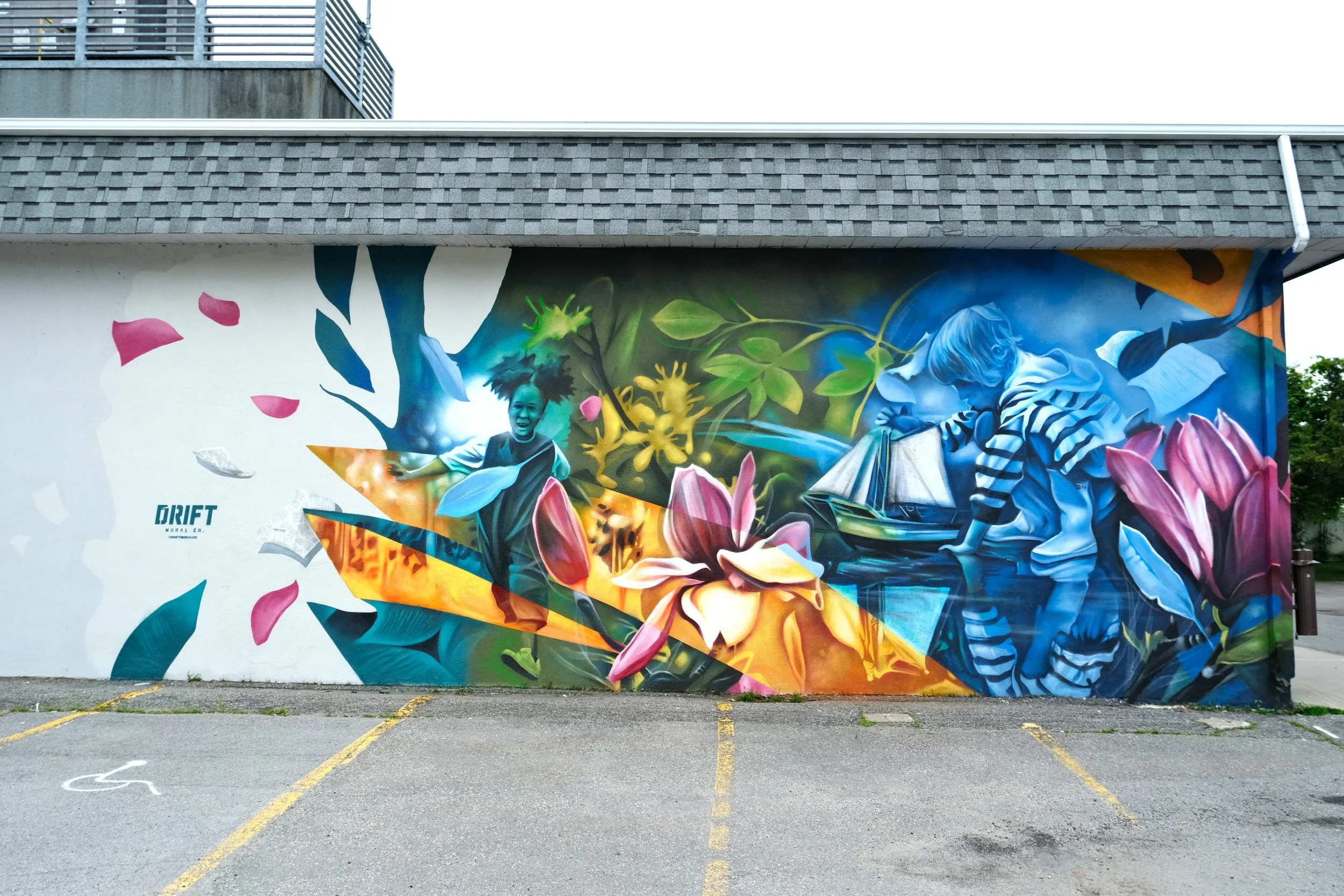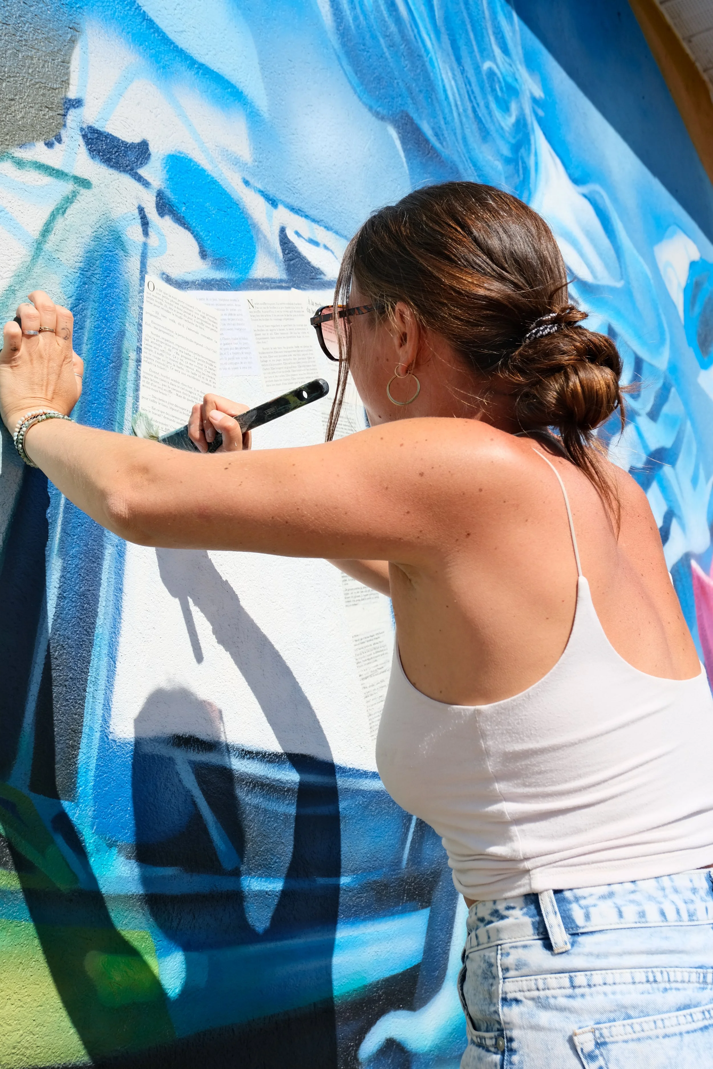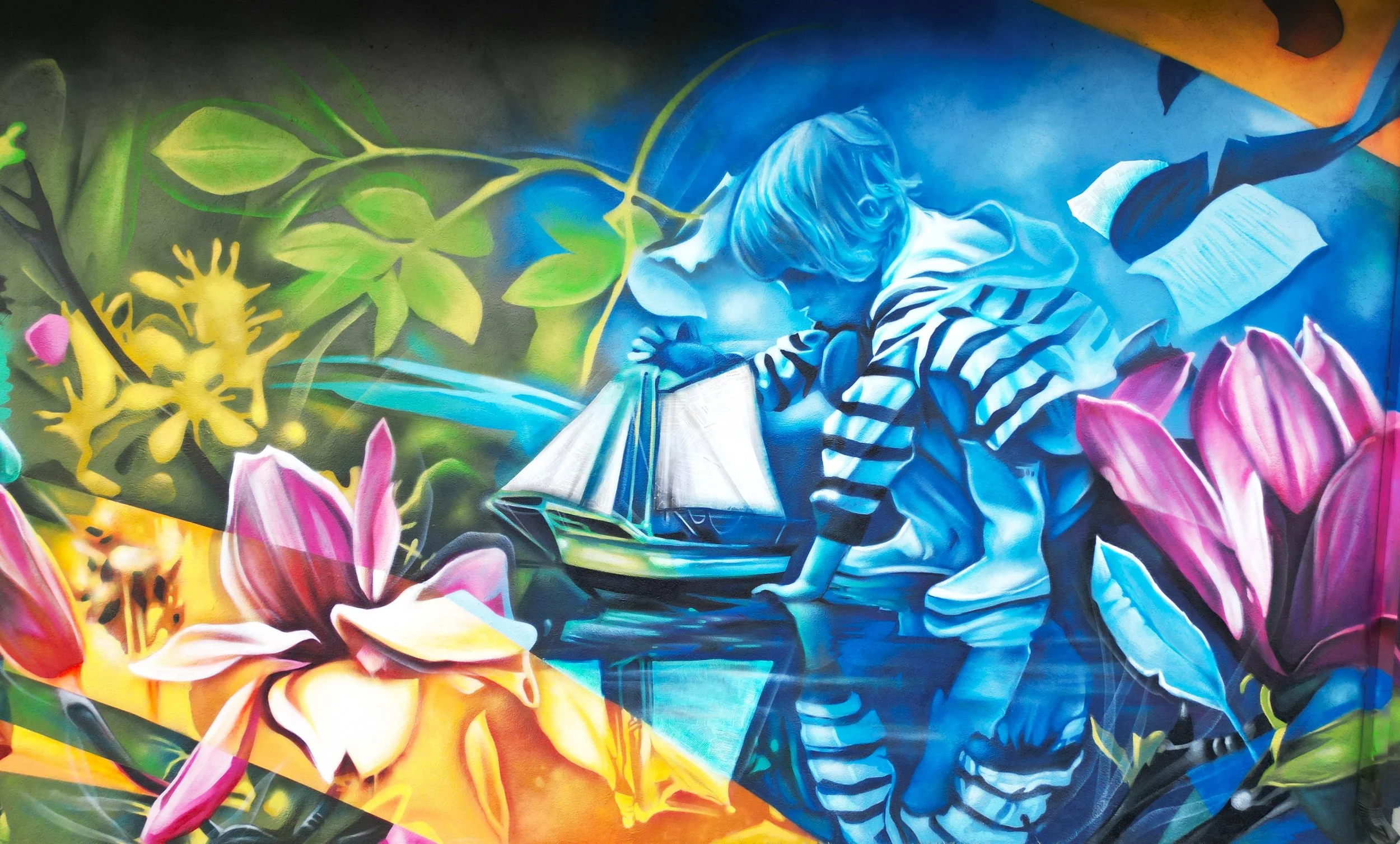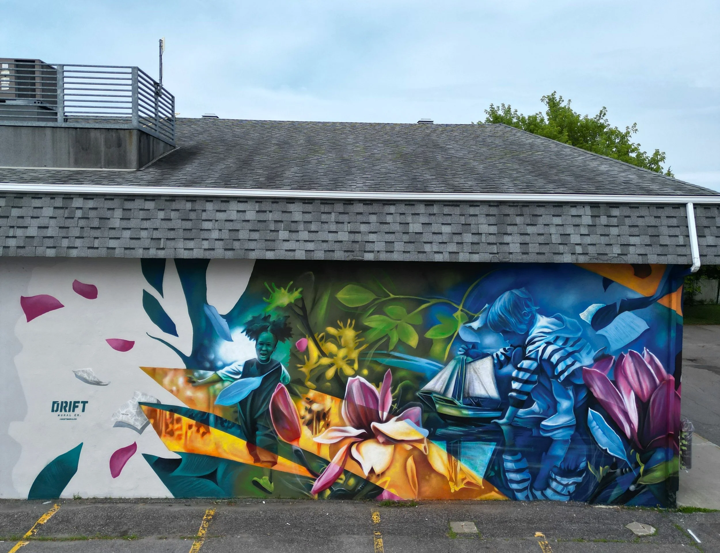 The mural is inspired by the library as the living heart of the neighborhood — a place of learning, connection, and discovery. It depicts a scene where children run and play with a small sailboat whose sails are made from book pages. Around them, native plants and flowers rise in the wind, symbolizing the journey, imagination, and growth that books can offer. This simple image evokes the richness, diversity, and energy of the community, while fostering a deep sense of belonging to this shared space.