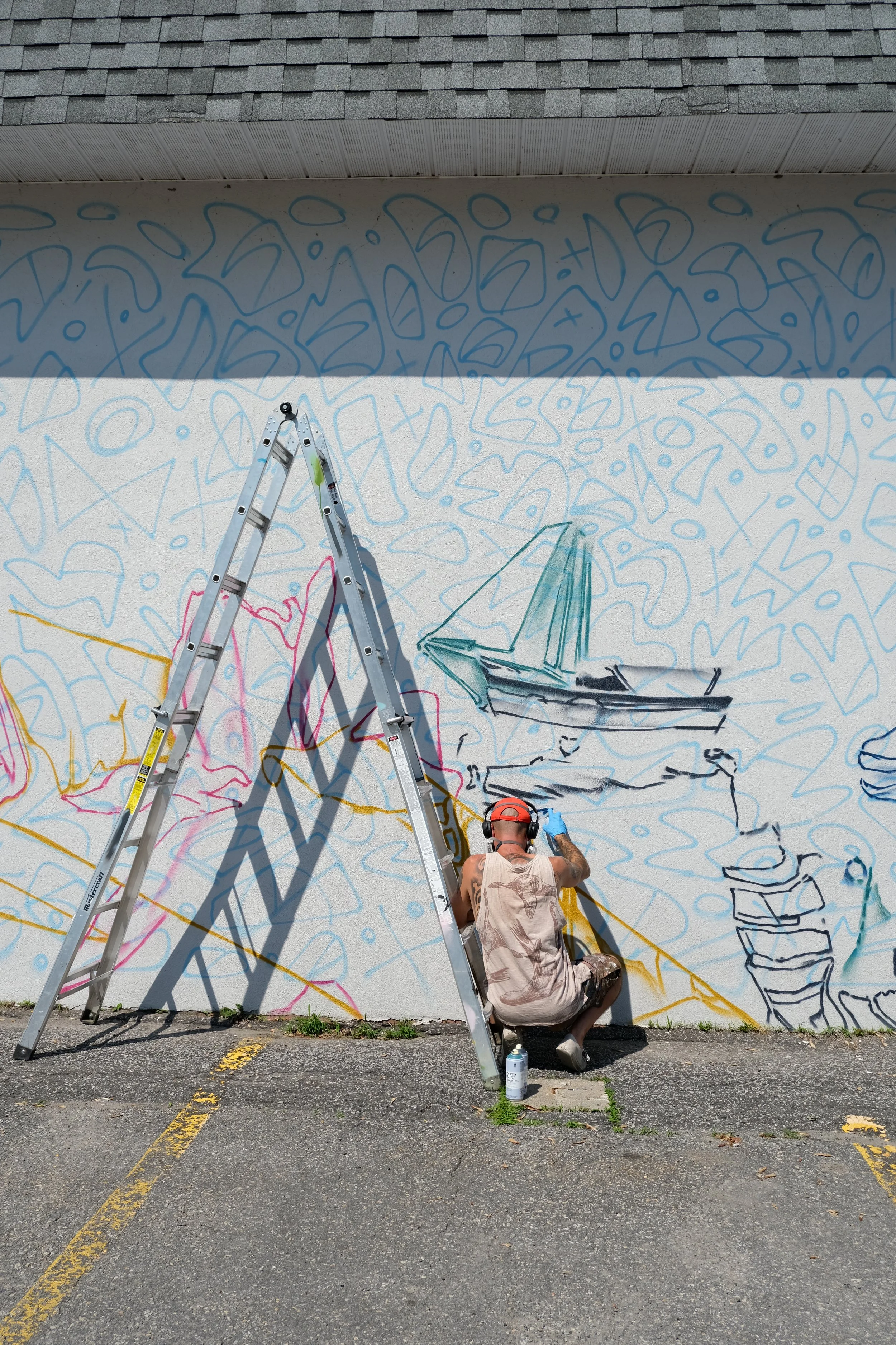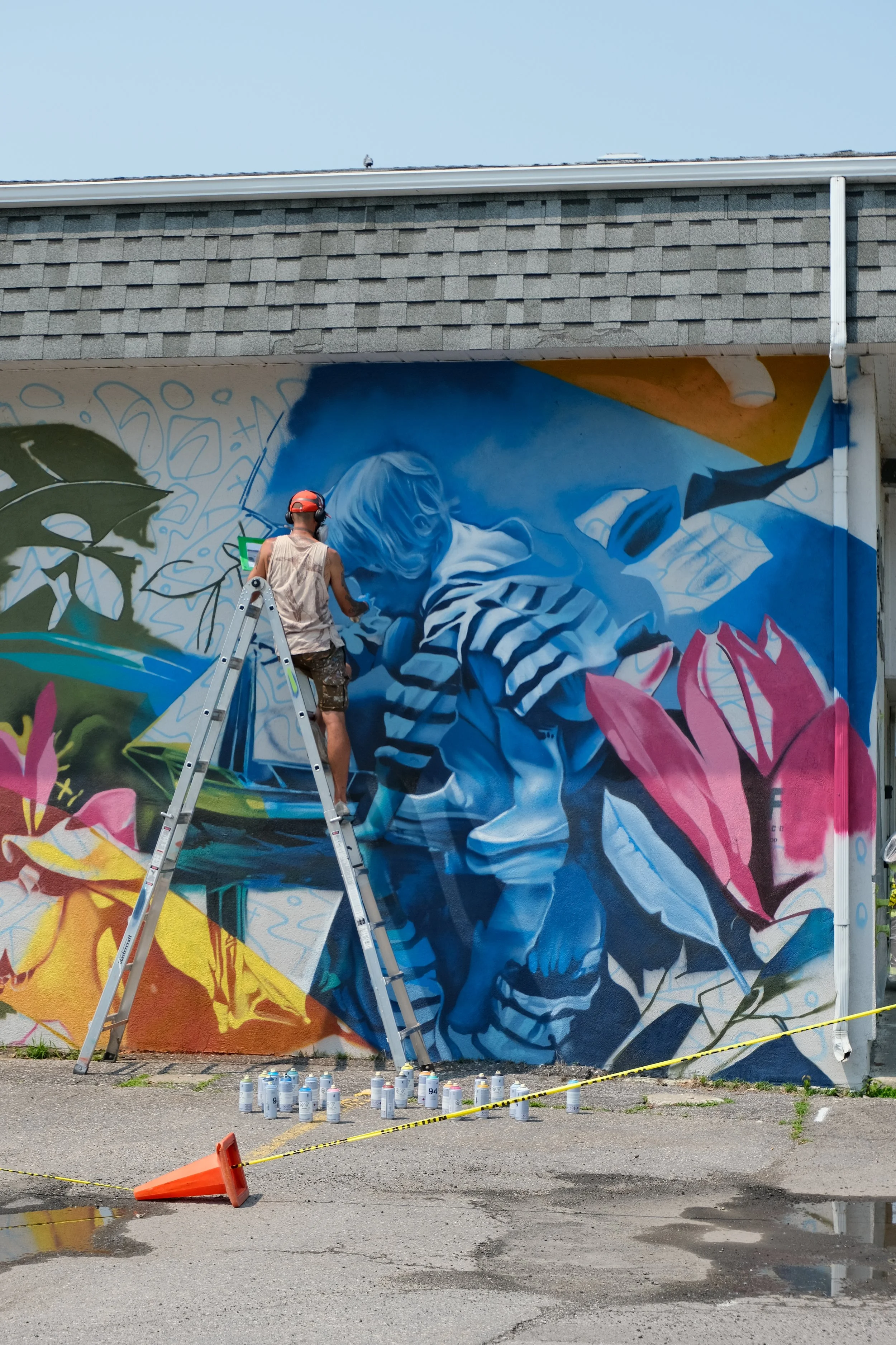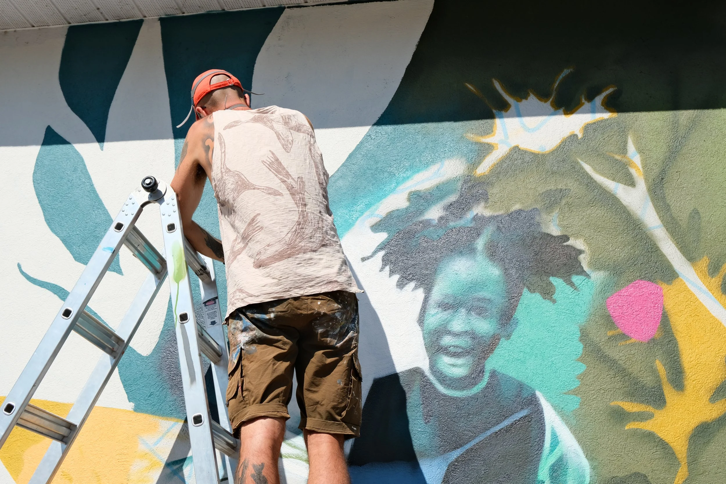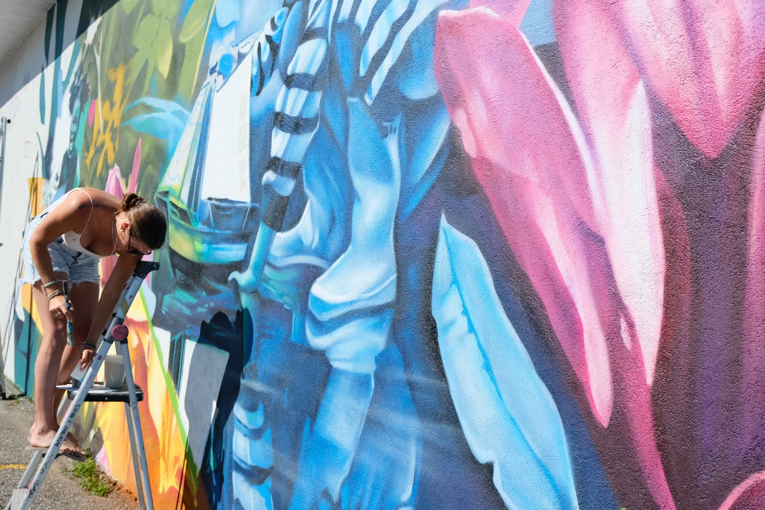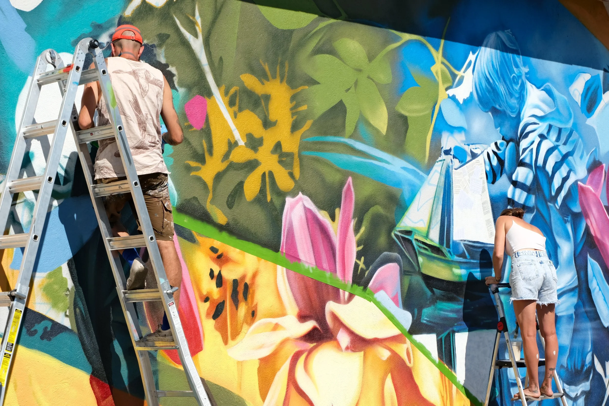 The mural is inspired by the library as the living heart of the neighborhood — a place of learning, connection, and discovery. It depicts a scene where children run and play with a small sailboat whose sails are made from book pages. Around them, native plants and flowers rise in the wind, symbolizing the journey, imagination, and growth that books can offer. This simple image evokes the richness, diversity, and energy of the community, while fostering a deep sense of belonging to this shared space.