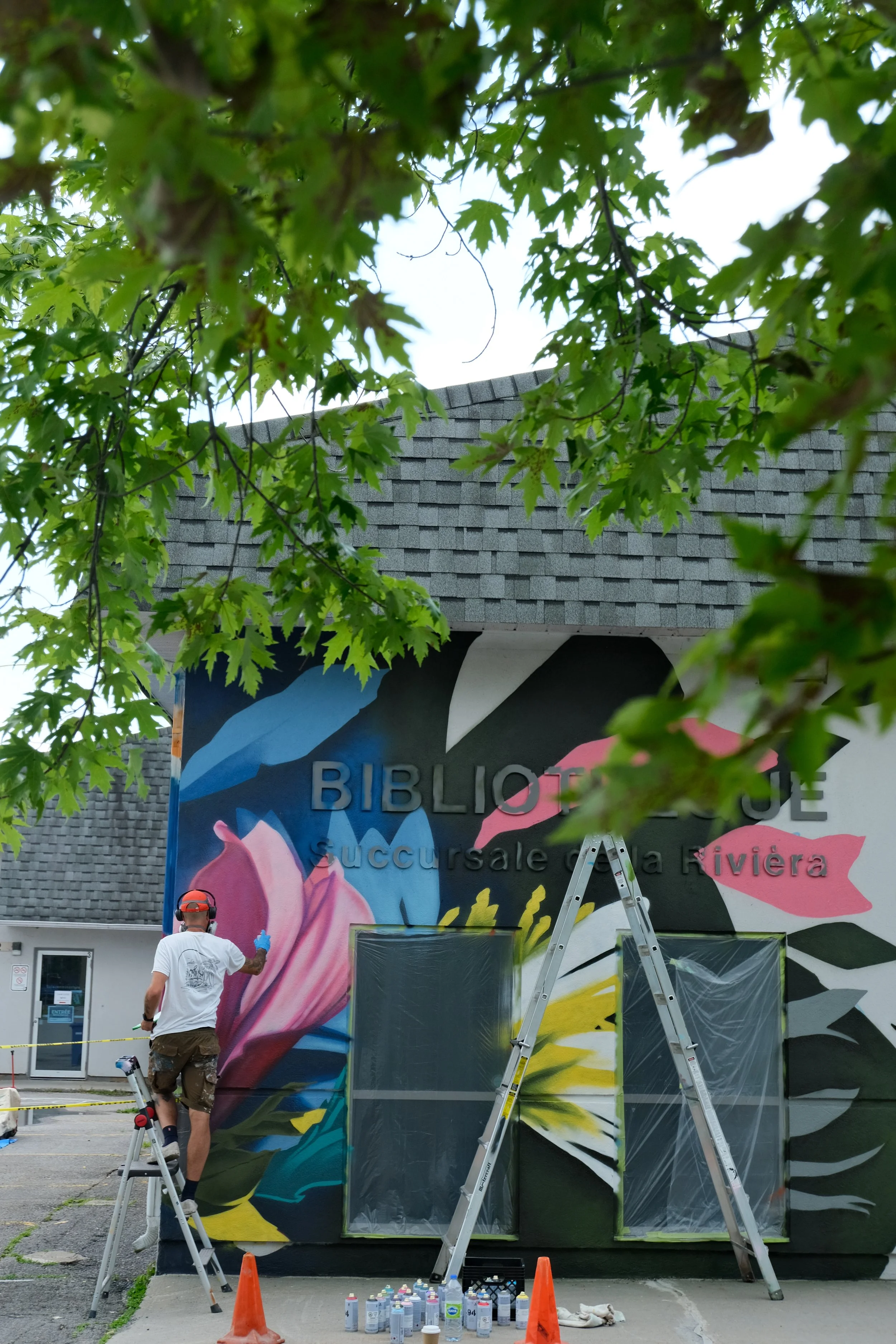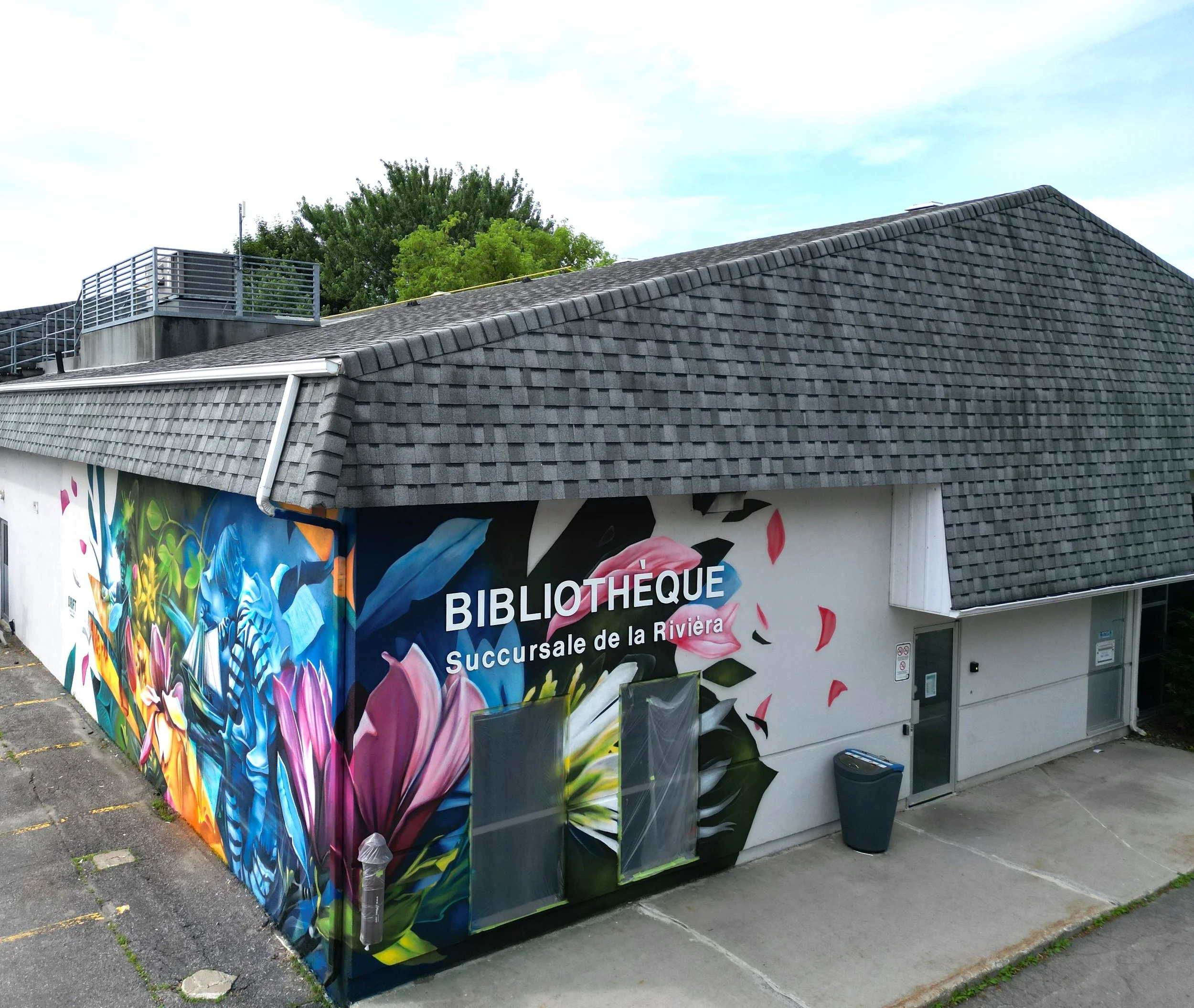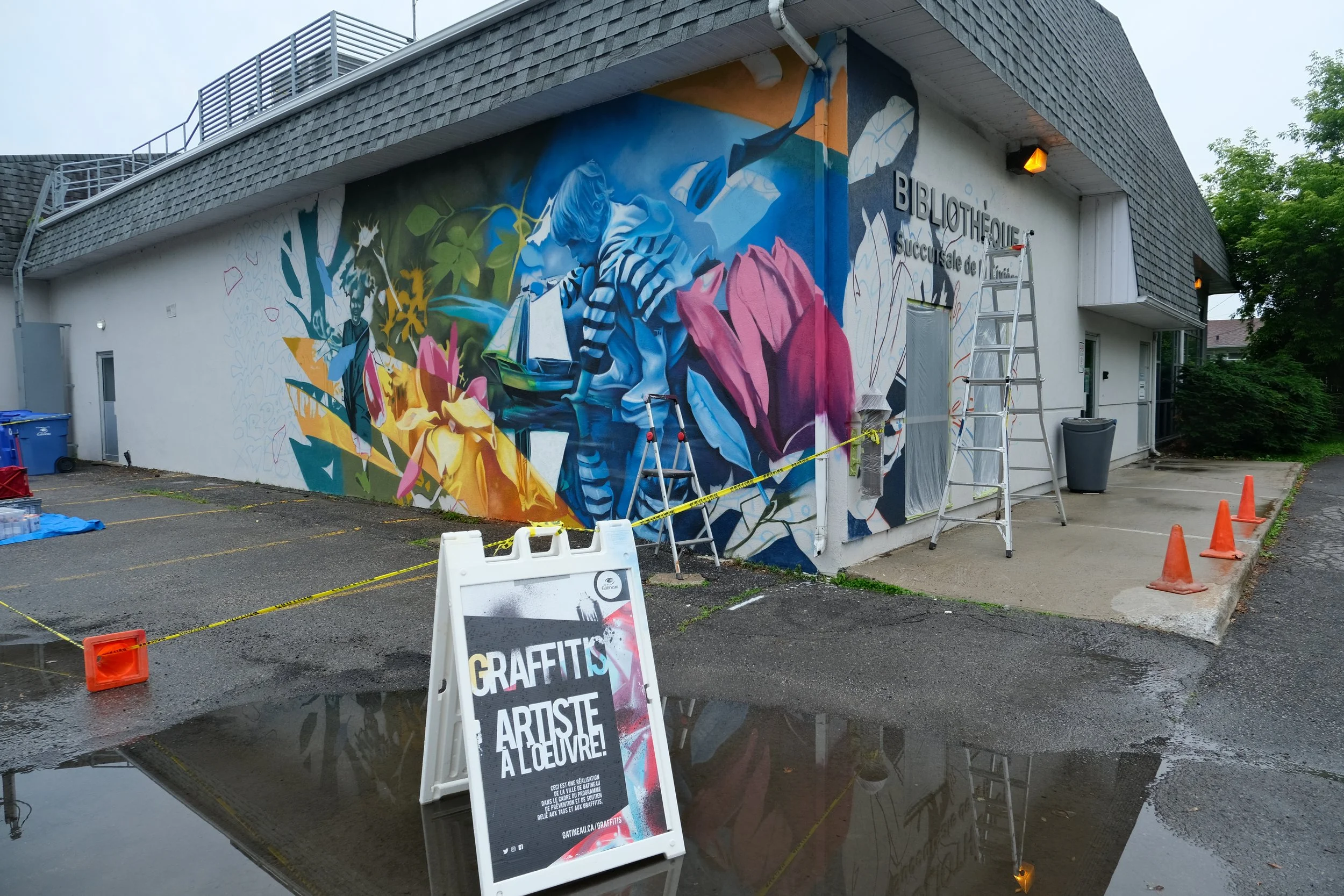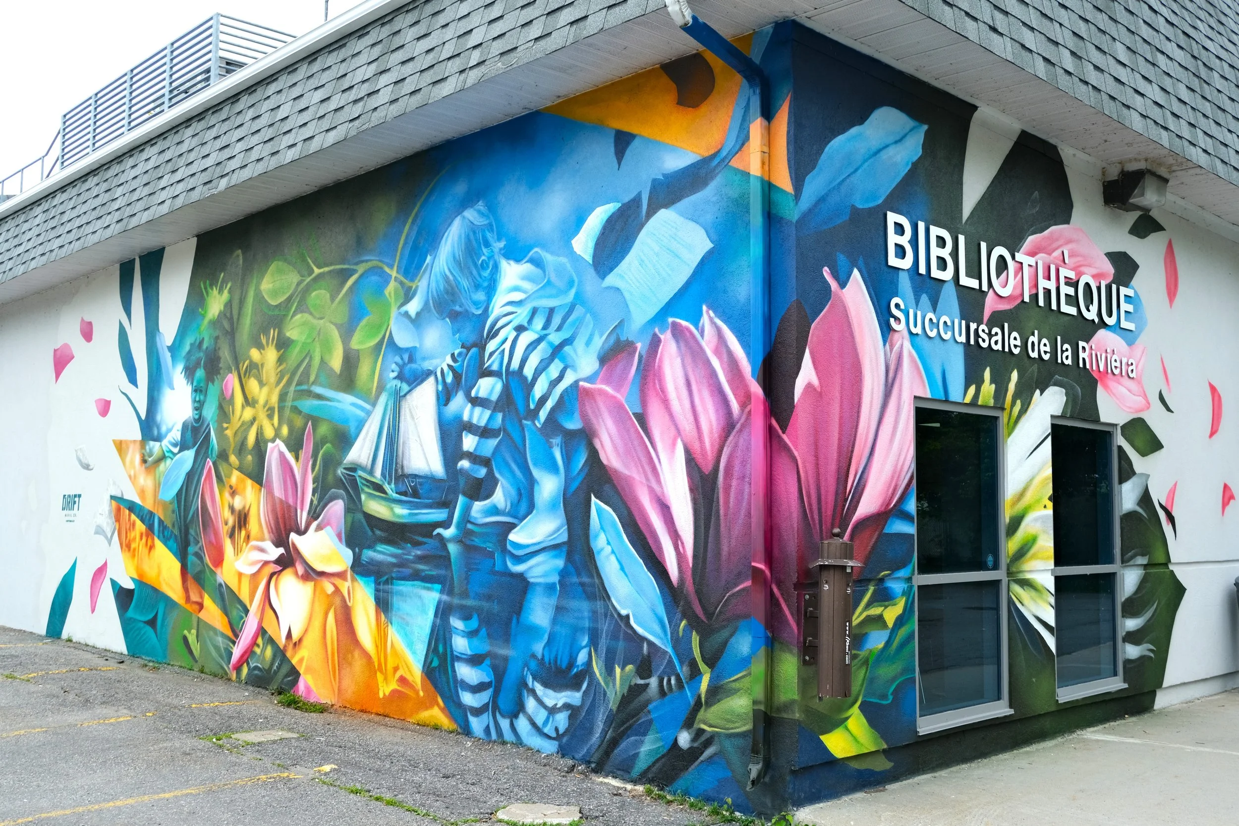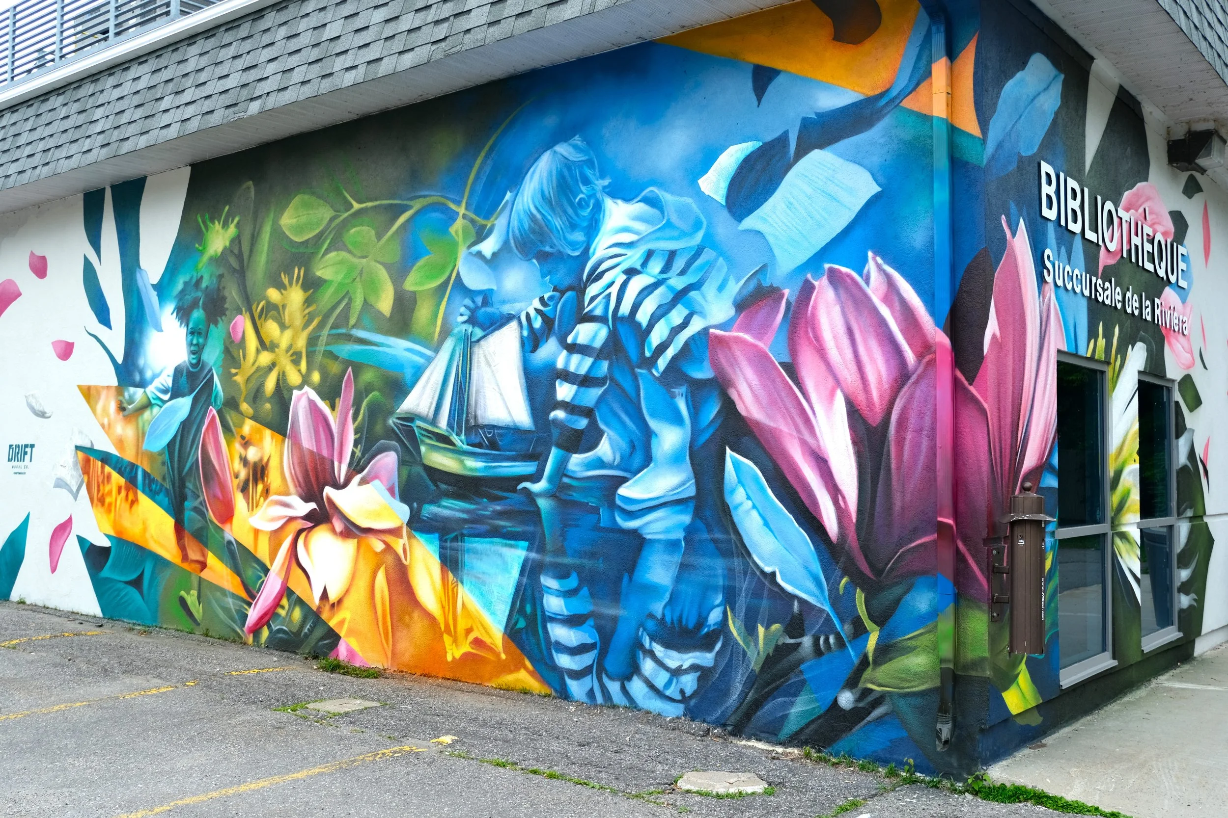 La murale s’inspire de la bibliothèque comme cœur vivant du quartier — un lieu d’apprentissage, de rencontres et de découvertes. Une scène où des enfants courent et jouent avec un petit voilier dont les voiles sont faites de pages de livres. Autour d’eux, des plantes et fleurs indigènes s’élèvent dans le vent, symbolisant le voyage, l’imagination et la croissance que les livres peuvent offrir. Cette image simple évoque la richesse, la diversité et l’énergie de la communauté, tout en nourrissant un profond sentiment d’appartenance à cet espace commun.