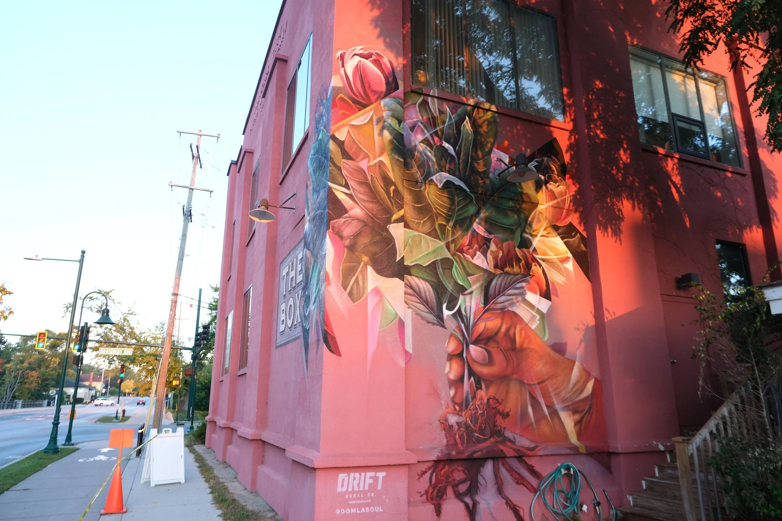 This mural is inspired by the site’s history as a cigar box factory while celebrating themes of growth and community. At its center, a hand gently cradles a bouquet—symbolizing the collective strength that comes from access to nature. The bouquet’s roots extend visibly, anchoring the imagery to the place and reflecting the deep connections within the community. Woven among the flowers are tobacco leaves, a nod to the building’s past and its role in shaping the neighborhood’s story.